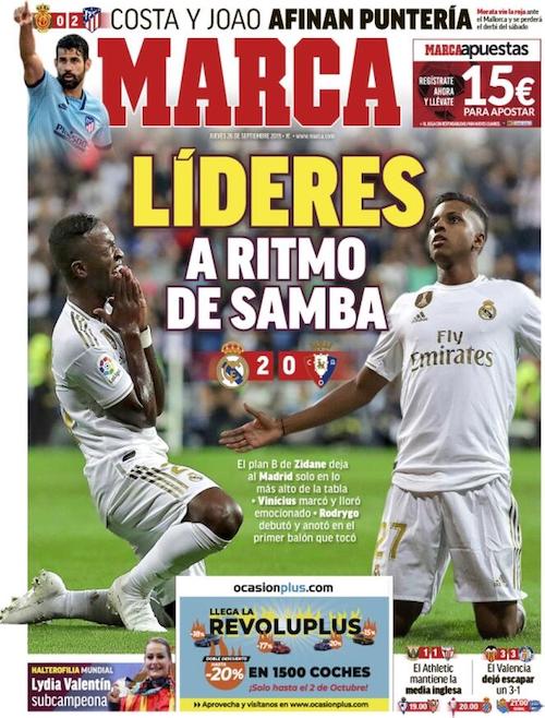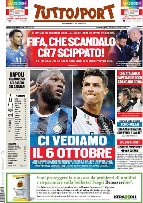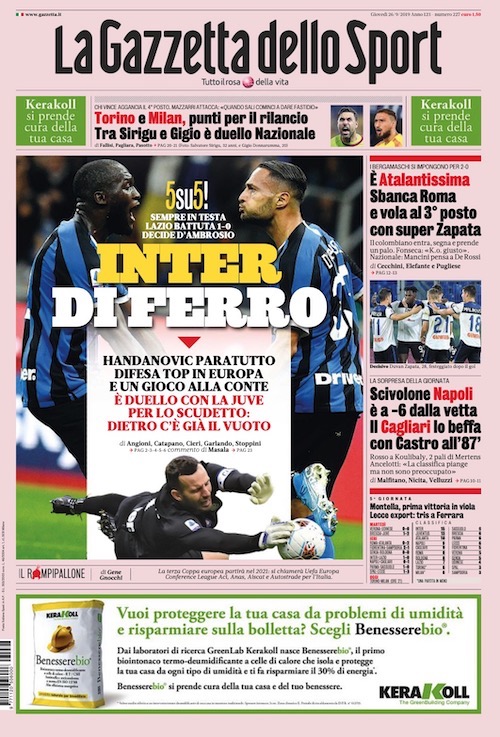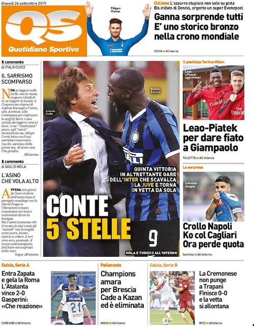 I principali quotidiani sportivi di oggi, giovedì 26 settembre, aprono con i risultati del turno infrasettimanale di Serie A. L’Inter ha battuto 1-0 a San Siro la Lazio ed è tornata in prima posizione in classifica a punteggio pieno dopo cinque partite. La squadra allenata da Antonio Conte ha sofferto nel primo tempo, dopo essere passata in vantaggio con un gol di Danilo D’Ambrosio. Nel secondo tempo ha controllato il gioco e rischiamo molto poco, andando anzi più volte vicino al secondo gol.