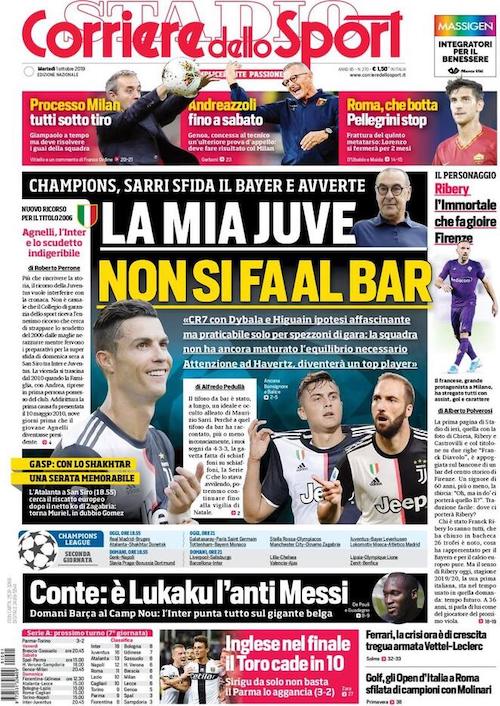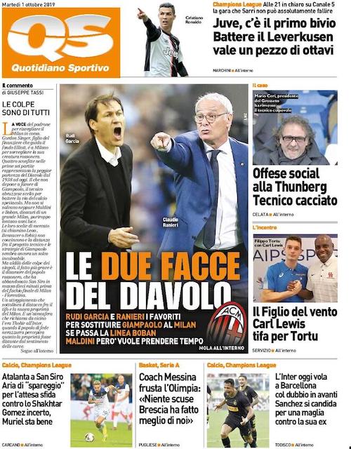 I principali quotidiani sportivi di oggi, martedì 1° ottobre, sono dedicate a Juventus-Bayer Leverkusen e Atalanta-Shakhtar Donetsk. Sono partite della seconda giornata della fase a gruppi di Champions League. L’Atalanta giocherà a San Siro alle 18:55 e la Juventus allo Stadium alle 21. Sia la Juventus che l’Atalanta vengono da una vittoria in campionato, ma nella prima giornata di Champions League la Juventus ha pareggiato 2-2 a Madrid contro l’Atletico e l’Atalanta ha perso 4-0 a Zagabria contro la Dinamo.