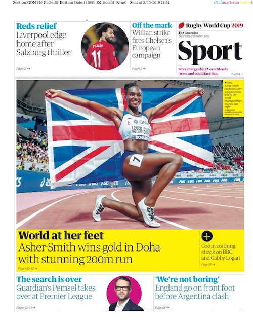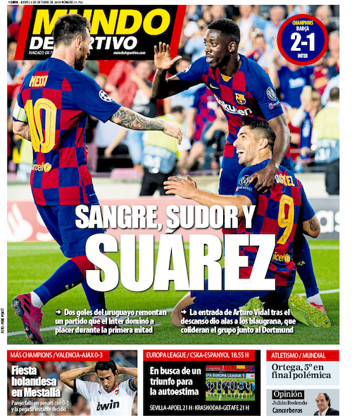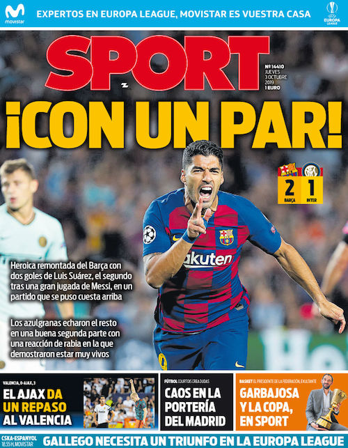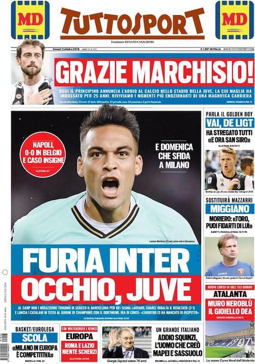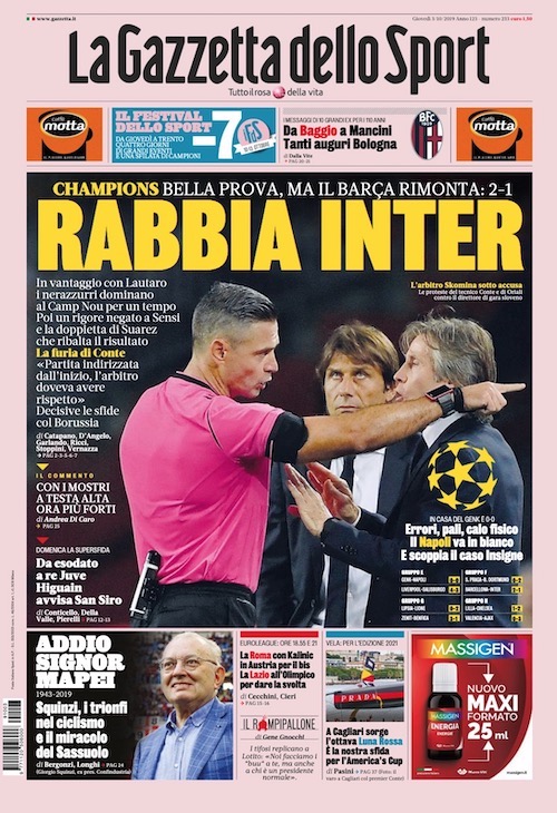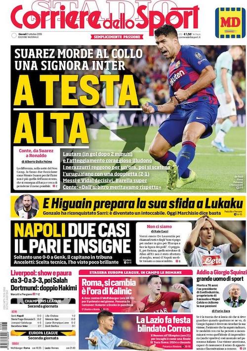 I principali quotidiani sportivi nazionali di oggi aprono con apprezzamenti condivisi per l’Inter a Barcellona. Nella partita di Champions League della seconda giornata la squadra di Antonio Conte ha perso 2-1 dopo aver giocato benissimo per il primo tempo. Passata in vantaggio dopo due minuti con un gol di Lautaro Martinez è andata più volte vicino al raddoppio. Nel secondo tempo è calata un po’ fisicamente e il Barcellona ha preso il controllo a centrocampo. Due straordinarie giocate individuali, di Luis Suarez la prima e di Leo Messi la seconda, hanno poi permesso alla squadra di Valverde di segnare due gol, entrambi firmati da Suarez. L’Inter aveva anche protestato per la mancata concessione di un calcio di rigore per un fallo in area su Sensi, tra i migliori in campo insieme a Barella.