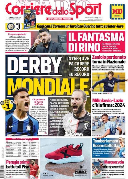 Le prime pagine dei principali quotidiani sportivi italiani di oggi sono già dedicate alla attesissima partita di domani sera. A San Siro per la settima giornata di Serie A si giocherà Inter-Juventus. Sono già stati tutti venduti i biglietti disponibili, per un totale di 76 mila spettatori previsti e 6,5 milioni di incasso. Il 20 per cento dei biglietti, fa peraltro notare il Corriere dello Sport, sono stati acquistati all’estero.