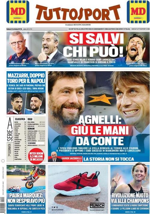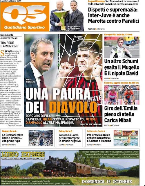 Il resto dello spazio in prima pagina sui giornali è dedicato in larga parte alla partita di stasera tra Genoa e Milan. Sia l’incarico di Marco Giampaolo al Milan che quello di Aurelio Andreazzoli al Genoa sono a rischio a causa dei risultati deludenti di queste prime giornate.