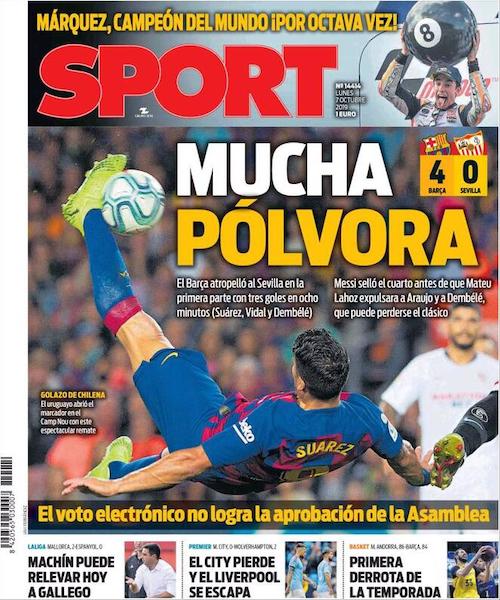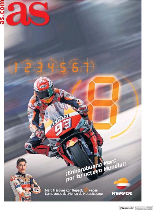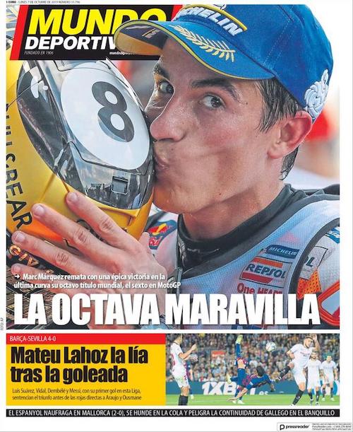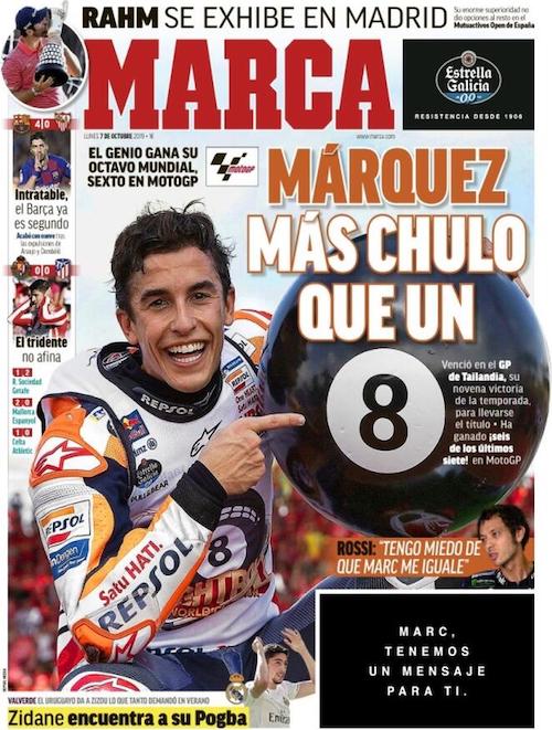 I quotidiani spagnoli aprono quasi tutti con la vittoria del Motomondiale da parte del pilota spagnolo della Honda Marc Marcquez. Vincendo ieri il Gran Premio di Thailandia si è matematicamente aggiudicato il quarto titolo mondiale consecutivo, dopo i due vinti in MotoGP e gli altri due precedenti in Moto2 e classe 125.