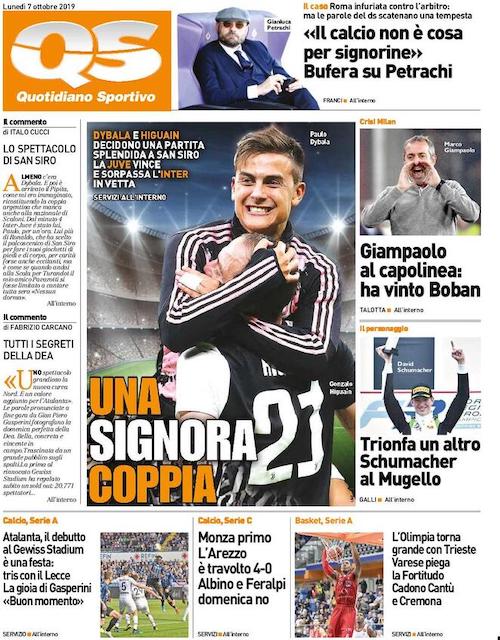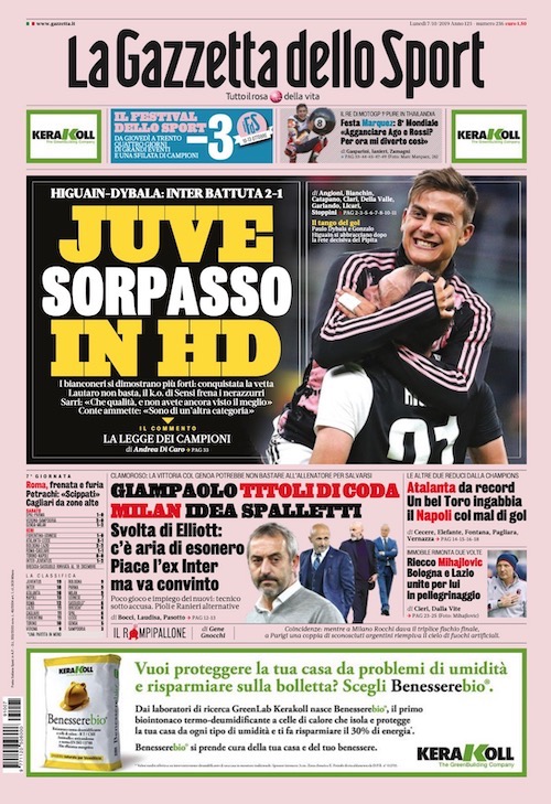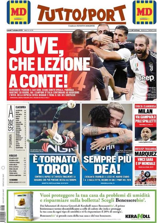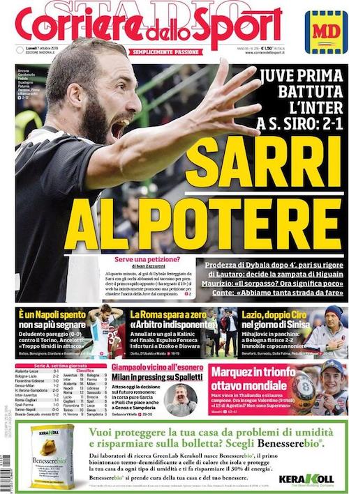 Le prime pagine dei quotidiani sportivi italiani di oggi, lunedì 7 ottobre, sono tutte dedicate alla vittoria della Juventus nel posticipo della settima giornata. Battendo l’Inter per 2-1 a San Siro la squadra di Maurizio Sarri si è portata in prima posizione in classifica con un punto di vantaggio. “Sono di un’altra categoria”, ha riconosciuto in conferenza stampa l’allenatore dell’Inter Antonio Conte.