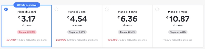 Il costo del servizio per chi sceglie il piano mensile è di € 10,87. La proposta più conveniente è quella del piano triennale, da pagare in un’unica soluzione, in offerta a € 3,17 al mese (risparmio del 70 per cento) per chi utilizza i link presenti in questa pagina o immette il codice coupon “ILVEGGENTE” al momento dell’acquisto. Si può pagare in moltissimi modi: PayPal, carte di credito, Apple Pay e Google Pay, buoni Amazon Pay e persino criptovalute. Solo per il piano triennale è inoltre disponibile un rimborso completo entro 30 giorni in caso di insoddisfazione o problemi con il servizio.