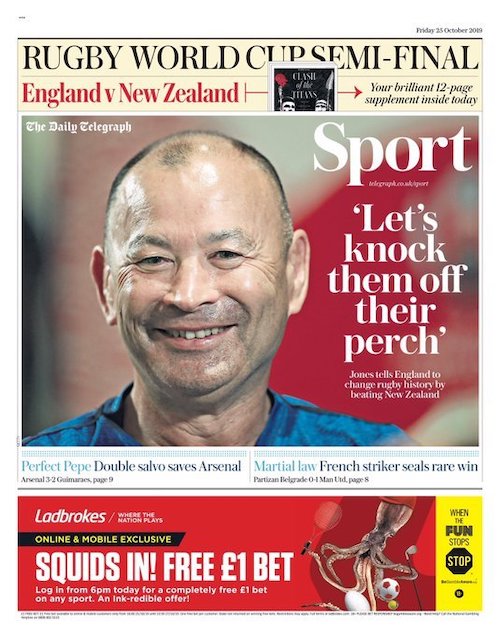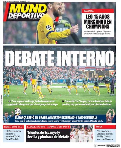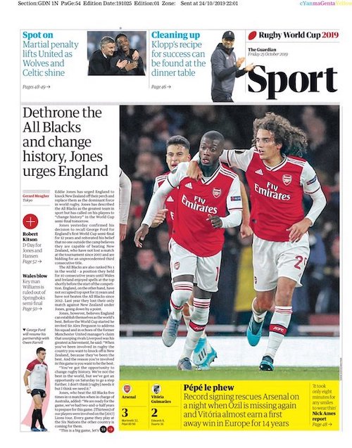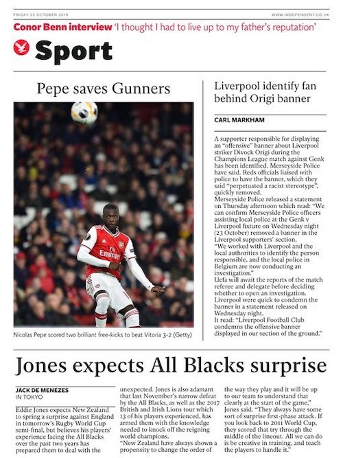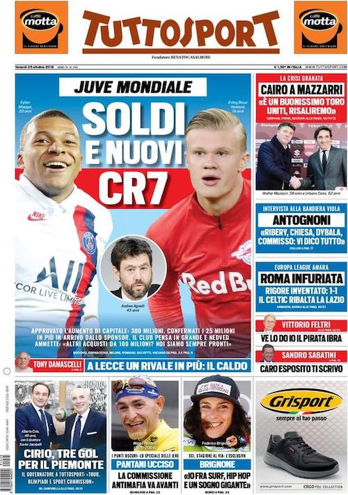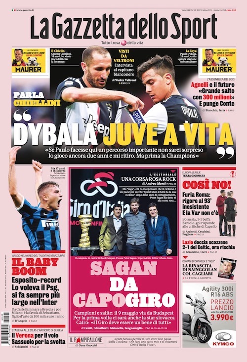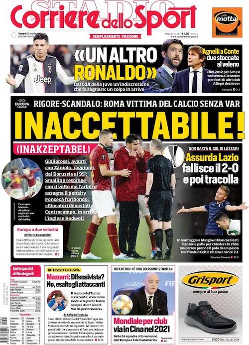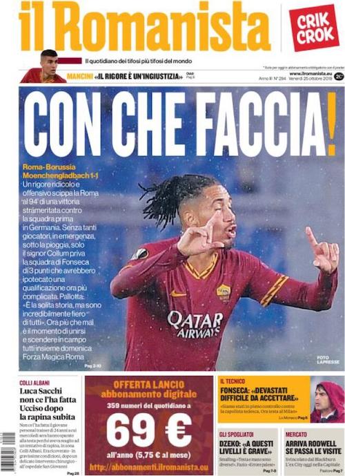 Il Corriere dello Sport apre l’edizione di oggi, venerdì 25 ottobre, con i risultati delle romane in Europa League. La Roma, in casa contro il Borussia Monchengladbach, si era portata in vantaggio intorno alla mezz’ora con un gol di Nicolò Zaniolo. Ha subìto il gol del pareggio su calcio di rigore concesso al quinto di recupero della partita, per un presunto fallo di mano di Smalling. C’è stata molta contestazione, in campo e anche fuori (non c’è il VAR, in Europa League). I replay delle azioni hanno chiaramente mostrato che il calciatore aveva respinto il pallone con il volto.