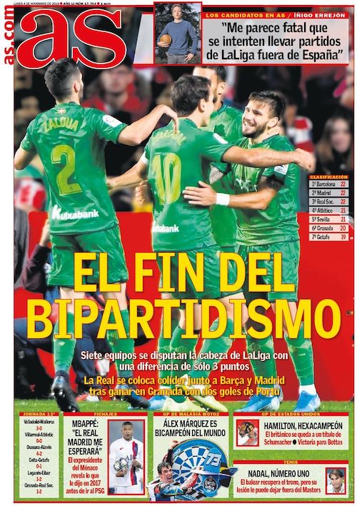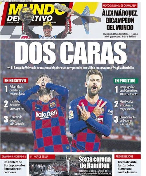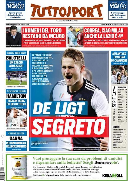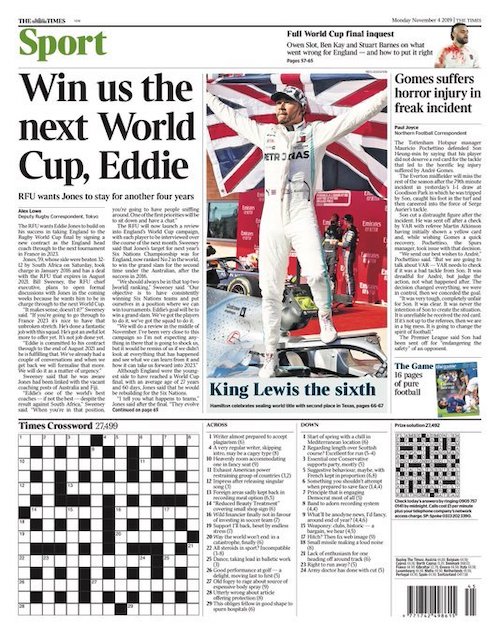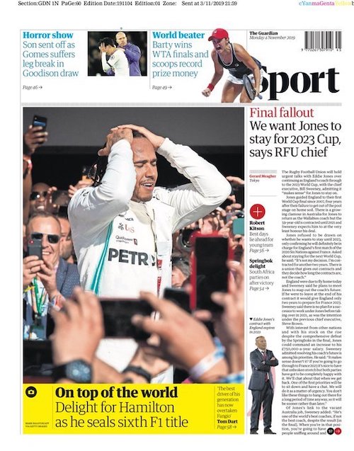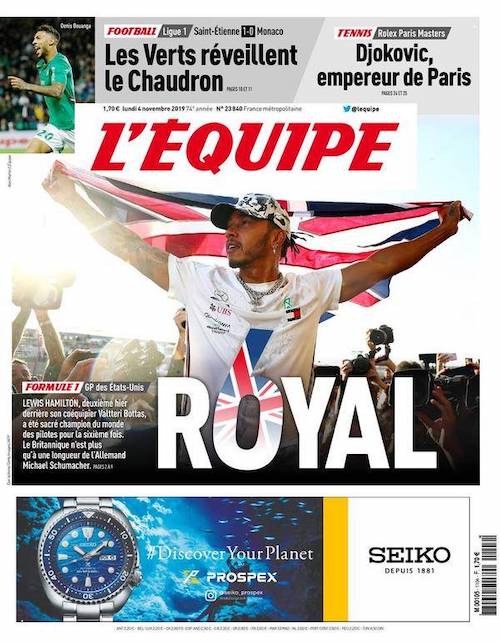 I principali quotidiani sportivi nazionali e anglosassoni di oggi, lunedì 4 novembre 2019, dedicano l’apertura a Lewis Hamilton. Grazia al secondo posto ottenuto ieri nel Gran Premio degli Stati Uniti il pilota inglese della Mercedes ha matematicamente vinto il campionato di Formula 1. È il suo sesto titolo in carriera: soltanto Michael Schumacher ne ha vinti di più, sette. La gara è stata vinta dal compagno di squadra di Hamilton, Valtteri Bottas. Le Ferrari sono andate abbastanza male: Leclerc quarto, Vettel ritirato.