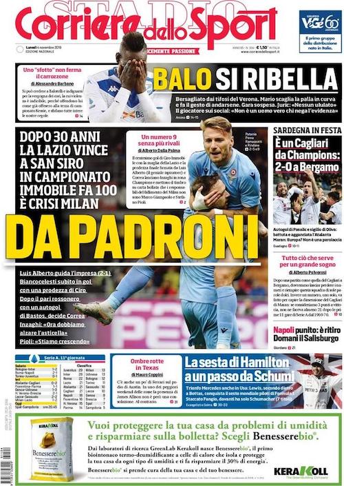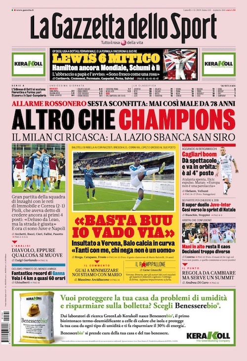 Il resto delle prime pagine italiane è dedicato ai risultati di Serie A. Ieri sera a San Siro la Lazio ha battuto il Milan per 2-1. Per il Milan è stata la sesta sconfitta in undici partite: non accadeva da 78 anni, ricorda la Gazzetta dello Sport. Grazie alla vittoria di ieri la Lazio si è invece portata in quarta posizione, condivisa con il sorprendente Cagliari di Rolando Maran, che ieri ha battuto 2-0 l’Atalanta a Bergamo.