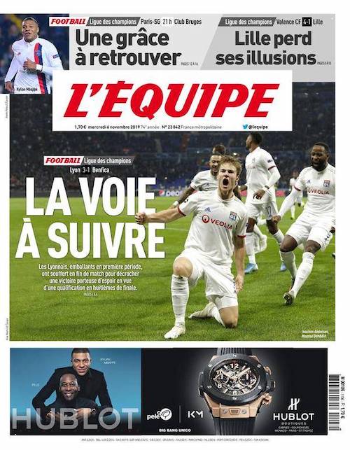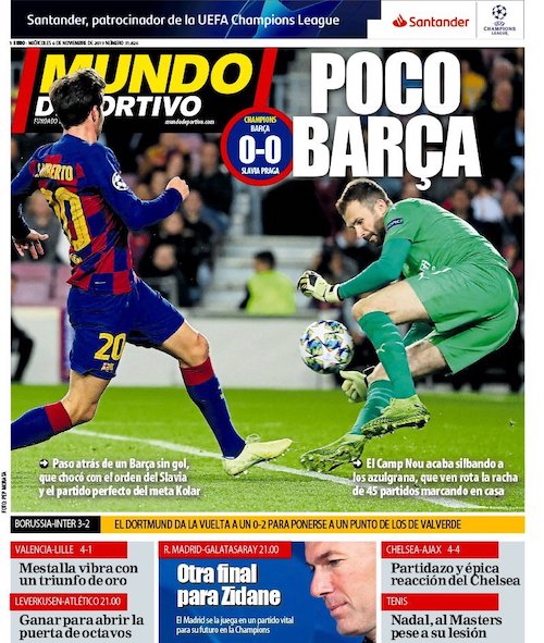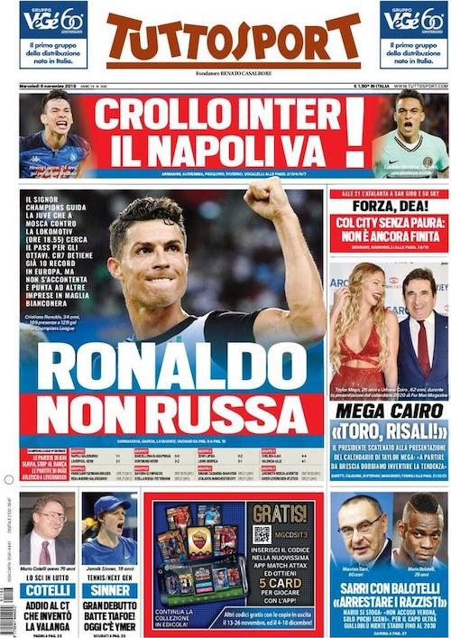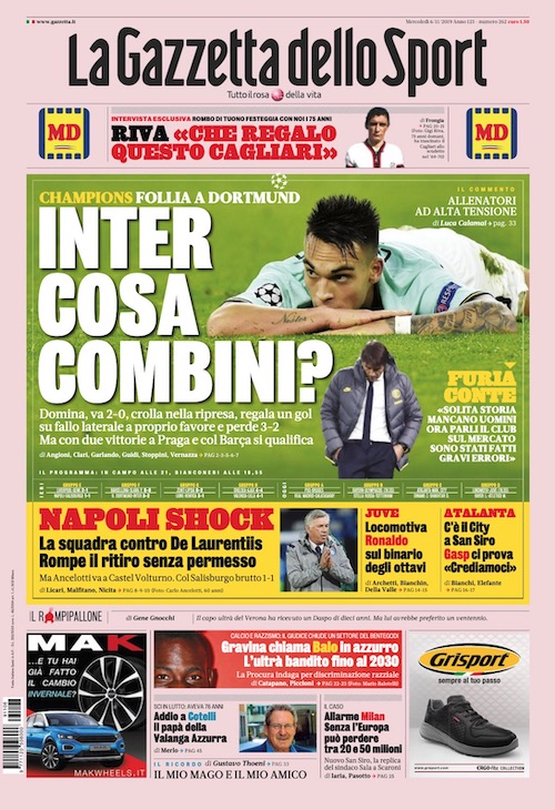 I principali quotidiani sportivi italiani di oggi, mercoledì 6 novembre, aprono con i risultati della Champions Leaugue. Ieri sera nella quarta partita della fase a gruppi l’Inter ha perso a Dortmund 3-2 dopo essere stata in vantaggio di due gol alla fine del primo tempo. Nel secondo il Borussia ha facilmente segnato tre gol, approfittando di alcune gravi disattenzioni difensive dell’Inter. Intervistato a fine partita l’allenatore Antonio Conte non ha rimproverato i suoi calciatori ma ha apertamente parlato di carenze della società nell’allestimento della squadra in fase di mercato.