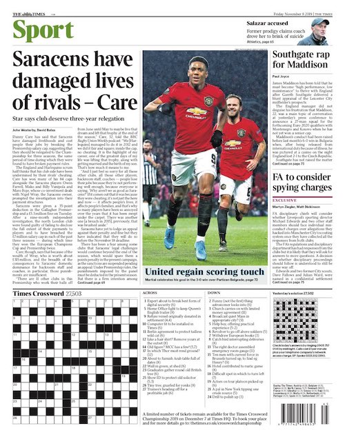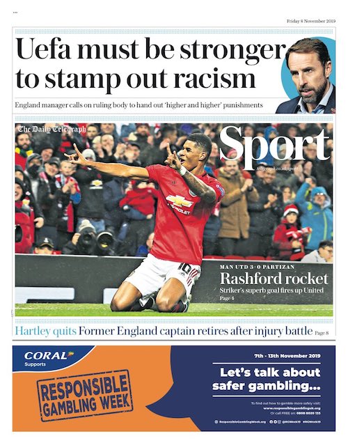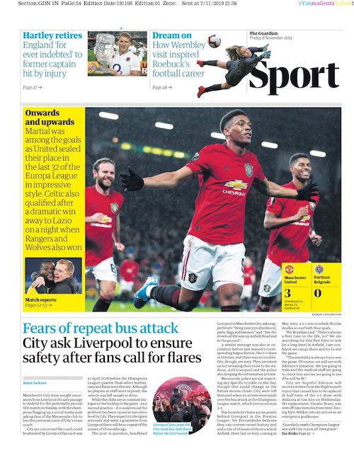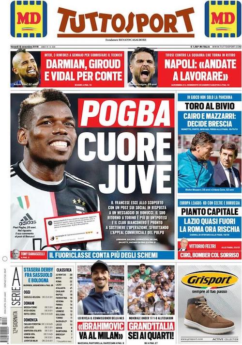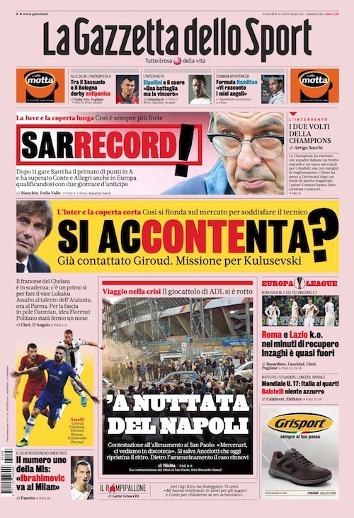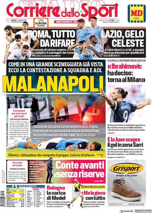 I principali quotidiani sportivi di oggi, venerdì 8 novembre 2019, hanno in prima pagina un riferimento alle contestazioni dei tifosi del Napoli al San Paolo. Da due giorni i rapporti tra il club e i calciatori appaiono molto tesi a causa del rifiuto della squadra di proseguire un ritiro stabilito dal presidente. La società ha quindi annunciato in un comunicato di avere intenzione di difendere i propri diritti anche in sede legale.