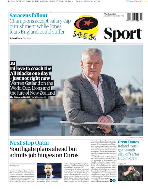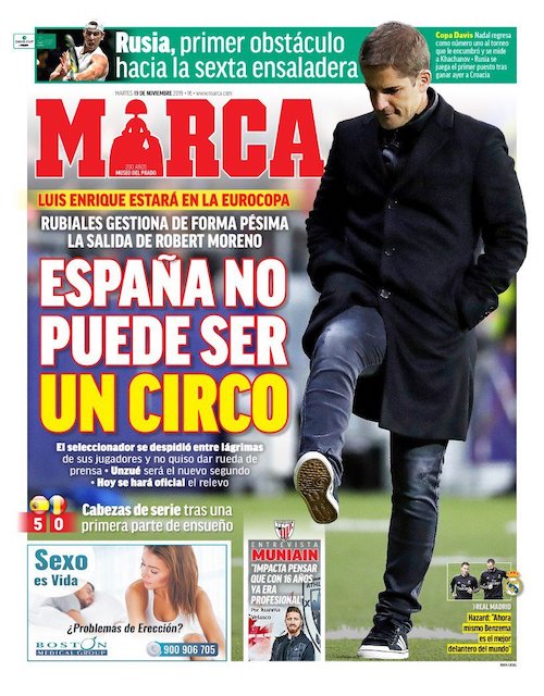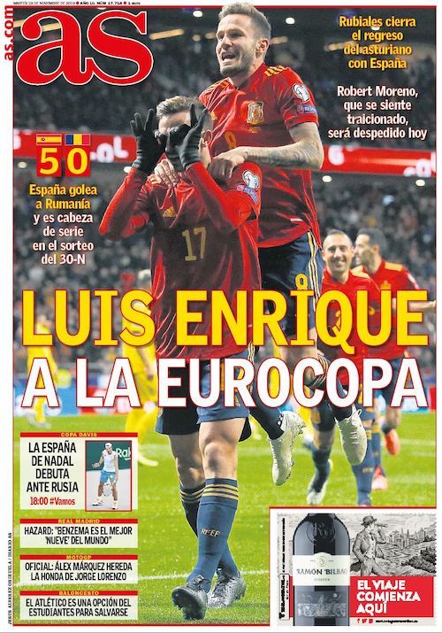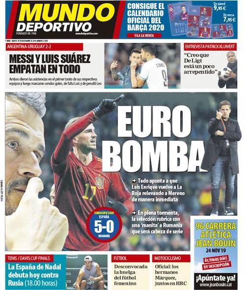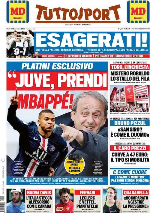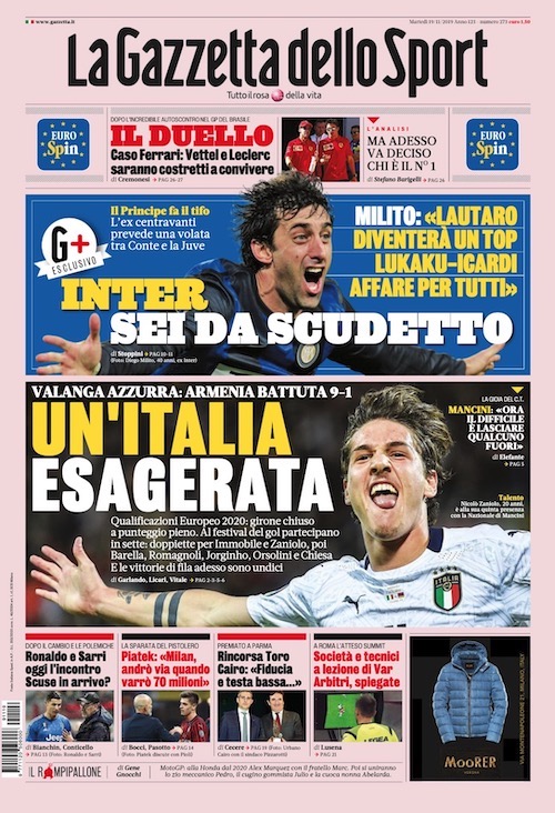 I principali giornali sportivi di oggi, martedì 19 novembre, dedicano la prima pagina alla schiacciante vittoria dell’Italia nell’ultima partita di qualificazione all’Europeo del 2020. Ieri sera a Palermo la nazionale del commissario tecnico Roberto Mancini ha battuto l’Armenia per 9-0. È stata la decima vittoria su dieci partite del girone di qualificazione. E per l’Italia è stata l’undicesima vittoria di fila in partite ufficiali, record assoluto di vittorie consecutive nella storia della nazionale.