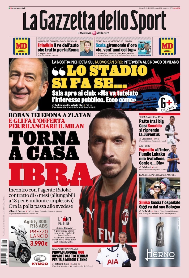 L’altra notizia riportata oggi sulla Gazzetta dello Sport riguarda Zlatan Ibrahimovic. L’attaccante svedese di 38 anni, scrive il quotidiano sportivo, sarebbe vicino a un accordo con il Milan, squadra in cui ha già giocato per due stagioni tra il 2010 e il 2012. Ne sarebbe prova un avvenuto incontro tra il dirigente del club ed ex calciatore Zvonimir Boban e Mino Raiola, procuratore di Ibrahimovic.