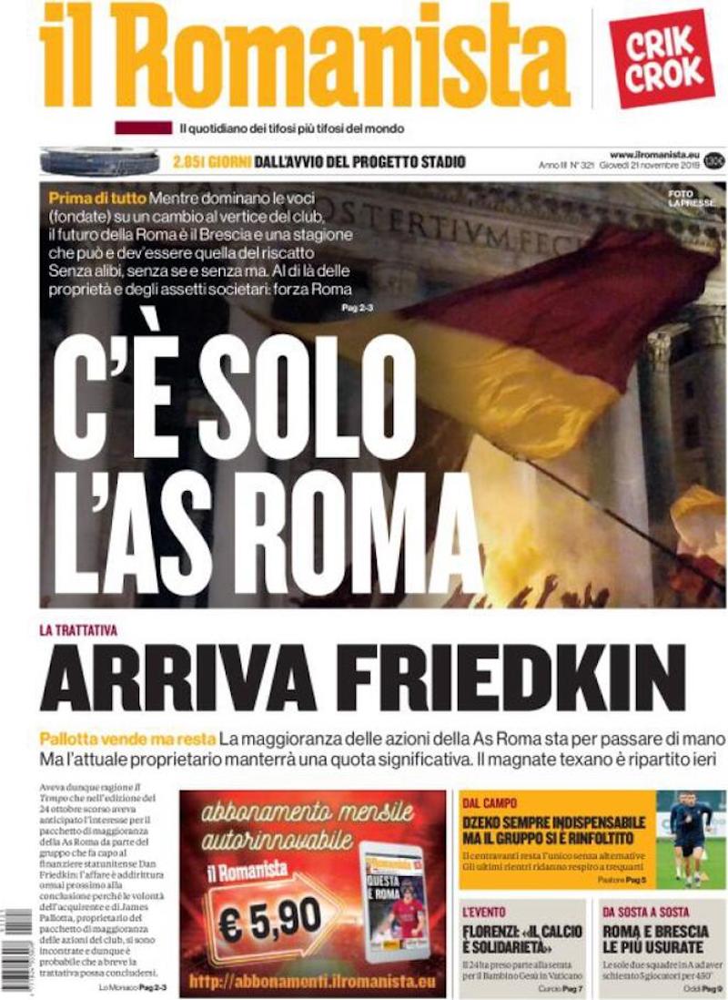 I principali quotidiani sportivi nazionali aprono oggi con approfondimenti vari sulla figura di Dan Friedkin, nuovo potenziale socio della Roma. Nella giornata di ieri è infatti rapidamente circolata la storia che Friedkin, a capo di un gruppo di investimento texano, sarebbe interessato a investire nel club di James Pallotta. L’ipotesi è che possa essere lui a coprire per intero un previsto aumento di capitale di 150 milioni di euro. Diventerebbe di fatto un socio di minoranza, considerando che l’attuale valore della Roma è stimato in circa 800 milioni di euro.