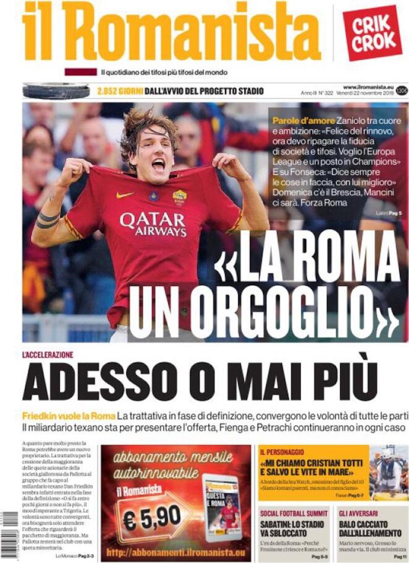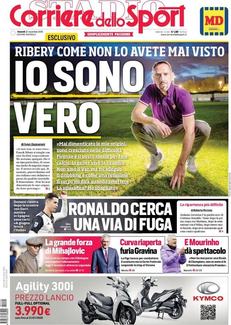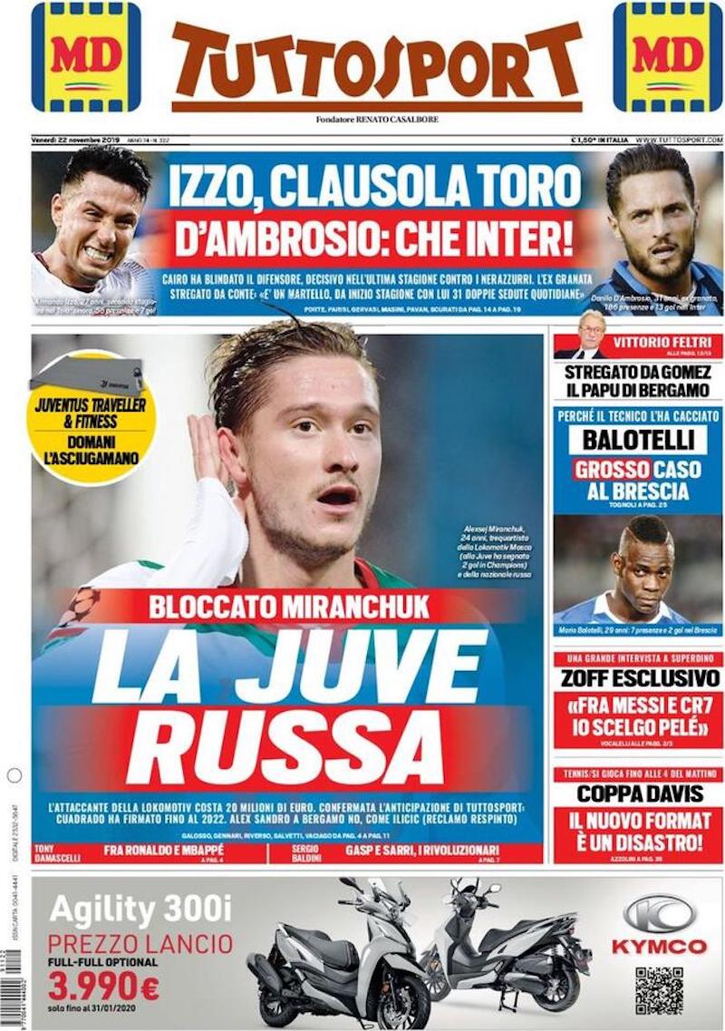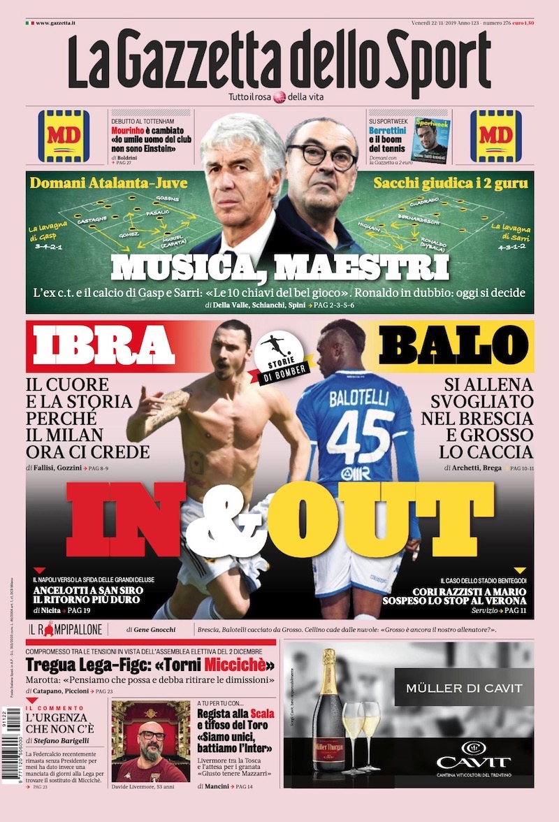 Sui principali quotidiani sportivi di oggi, venerdì 22 novembre, c’è ampio spazio dedicato al campionato di Serie A. Domani alle 15, dopo l’ultima sosta del 2019 per gli impegni delle nazionali, comincerà la tredicesima giornata. “Musica, maestri” è l’espressione usata in prima pagina dalla Gazzetta dello Sport per accrescere le aspettative intorno ad Atalanta-Juventus, partita tra squadre allenate da due dei più apprezzati allenatori d’Italia.