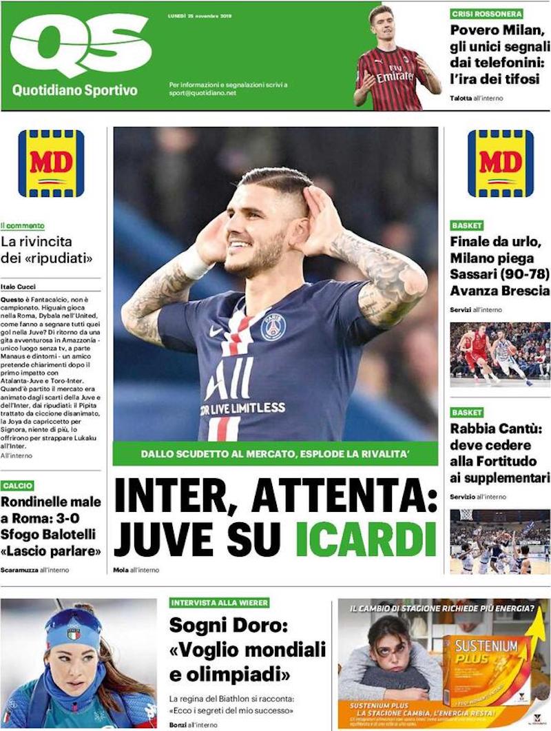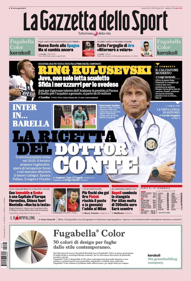 La Gazzetta dello Sport apre l’edizione di oggi con le possibili nuove soluzioni tattiche dell’allenatore dell’Inter Antonio Conte. Nella partita vinta a Torino sabato per 3-0 l’Inter ha perso un altro centrocampista, Nicolò Barella, che dovrà operarsi per una distorsione a un ginocchio. L’assenza prevista è di almeno un mese, e intanto l’Inter “prepara Gagliardini e spera di recuperare Sensi”, scrive la Gazzetta.