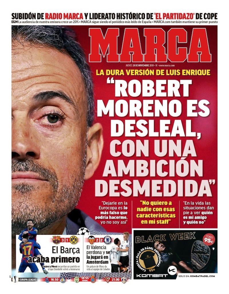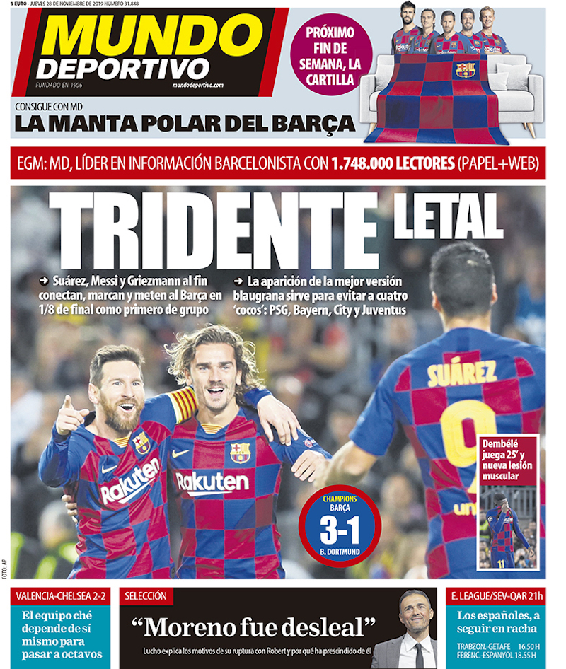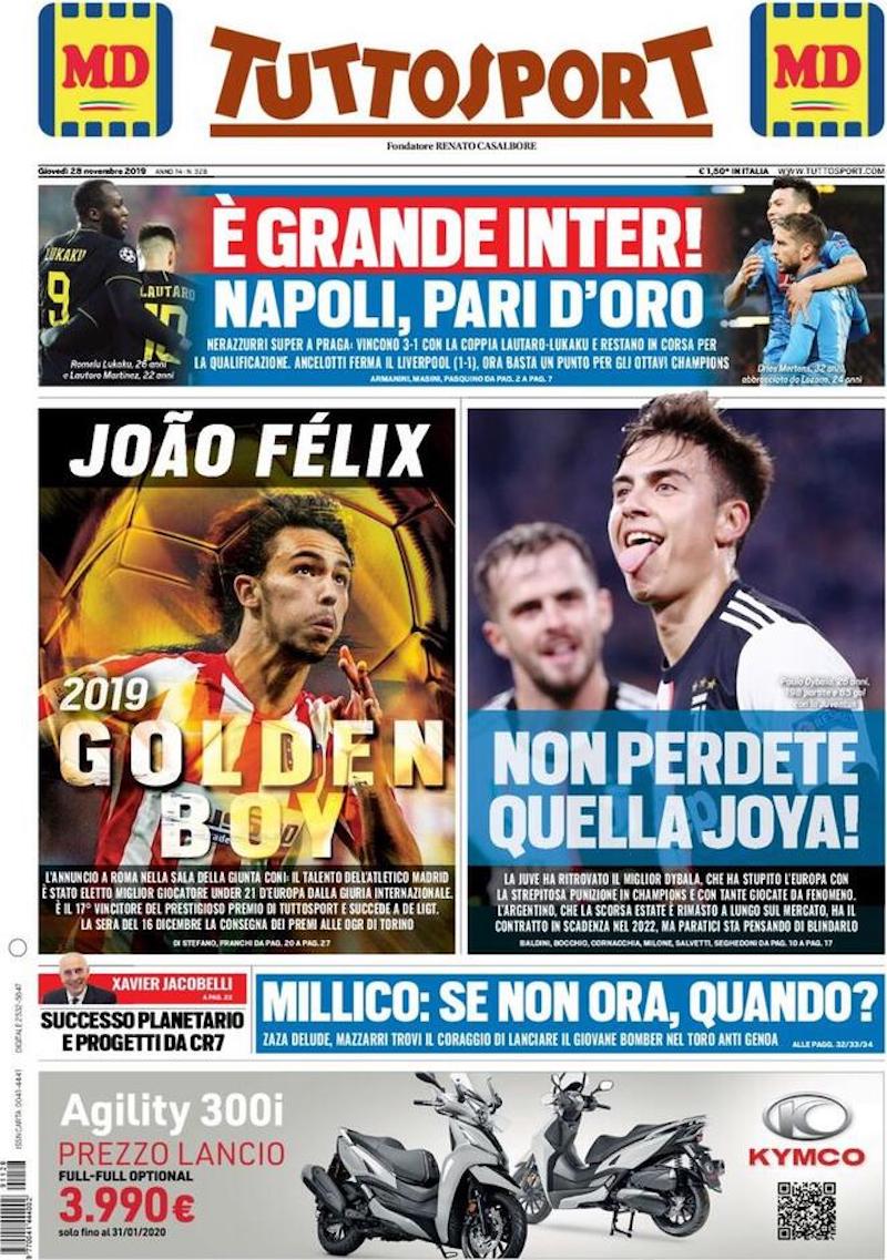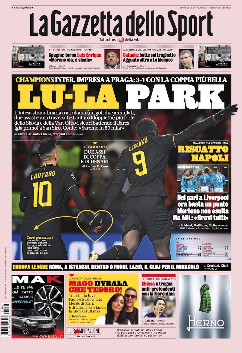Le aperture dei principali giornali e siti sportivi sono dedicate oggi ai risultati completi delle partite della penultima giornata della Champions League. A Praga l’Inter ha battuto autorevolmente per 3-1 lo Slavia Praga, mantenendo speranze di qualificazione agli ottavi di finale. Per riuscirci dovrà battere all’ultima giornata, a San Siro, il Barcellona, già primo e qualificato. Lautaro Martinez ha segnato due gol, e a Lukaku – che ha segnato il terzo – ne sono stati annullati altri due. Il lavoro di entrambi gli attaccanti dell’Inter è stato lungamente apprezzato dagli addetti.