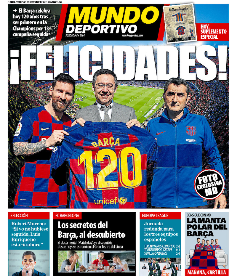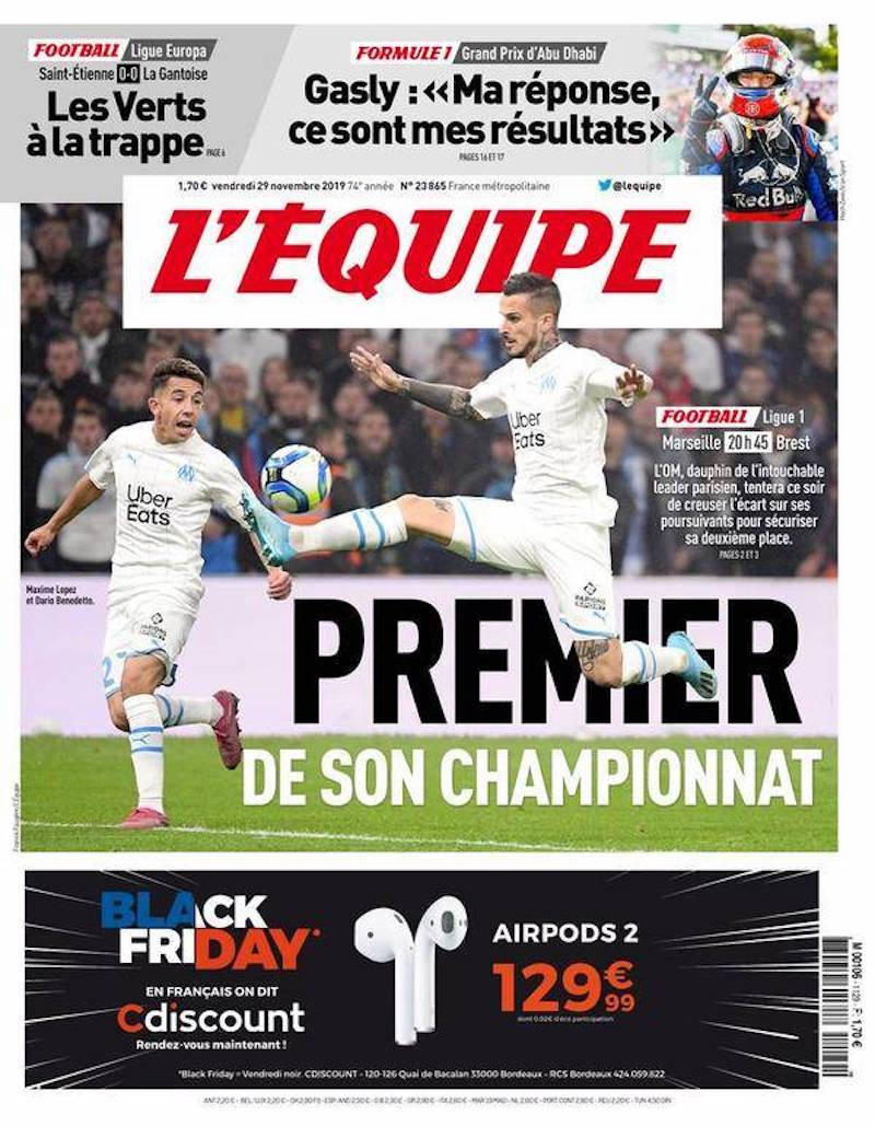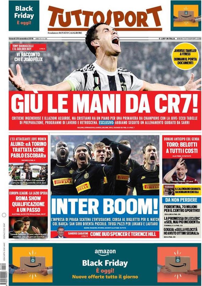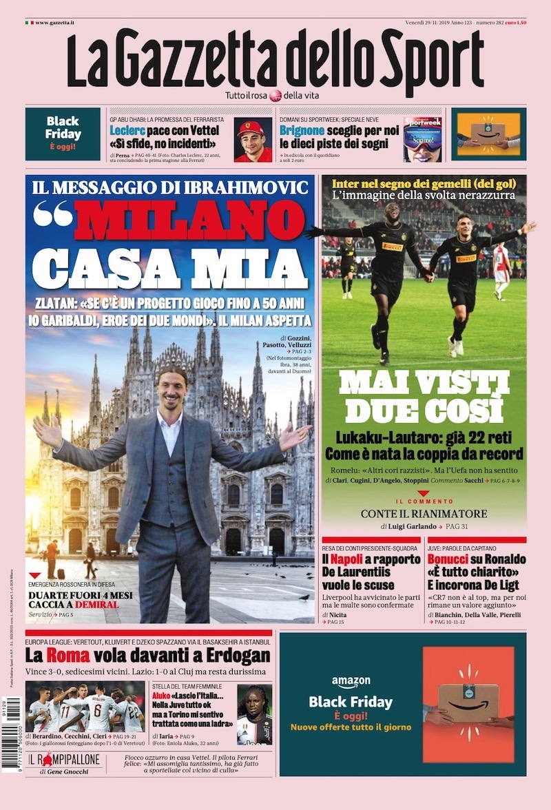 I quotidiani sportivi italiani di oggi dedicano spazio in prima pagina ai risultati della quinta giornata della fase a gruppi di Europa League. La Roma ha battuto piuttosto nettamente il Basaksehir a Istanbul, per 3-0, con gol di Veretout, Kluivert e Dzeko. Di conseguenza ha quasi ottenuto la qualificazione ai sedicesimi: le basterà un pareggio all’ultima, in casa contro il Wolfsberg.