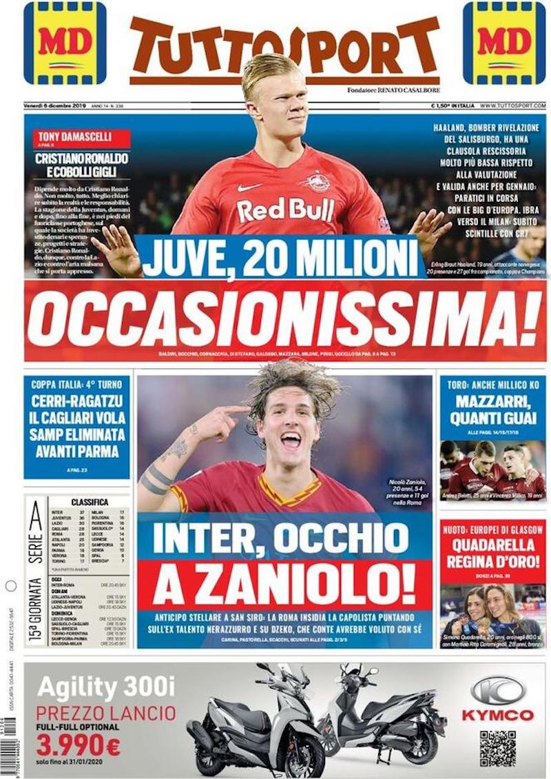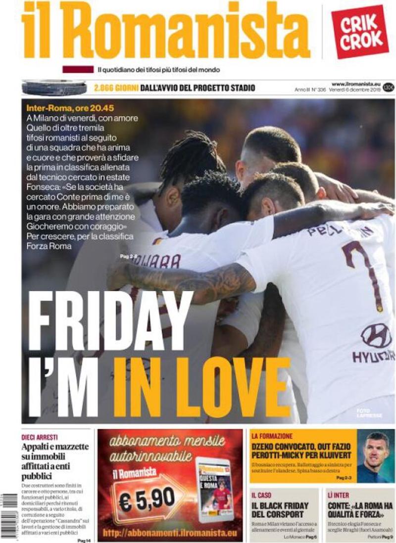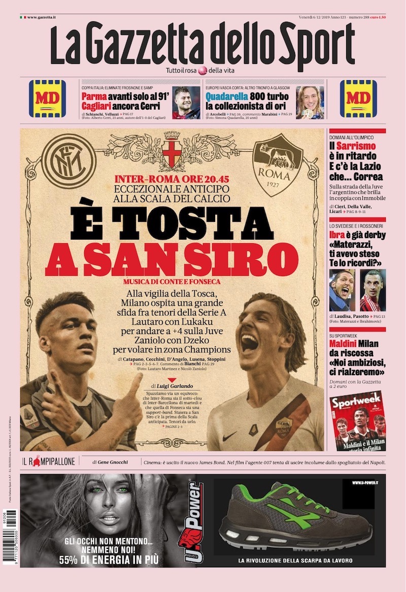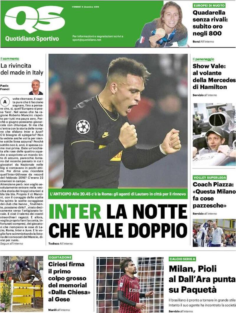 Le altre informazioni sulle prime pagine riguardano la partita di Serie A di stasera tra l’Inter e la Roma. È l’anticipo della quindicesima giornata, atteso sia per la notorietà delle due squadre che per il loro ottimo stato di forma attuale.