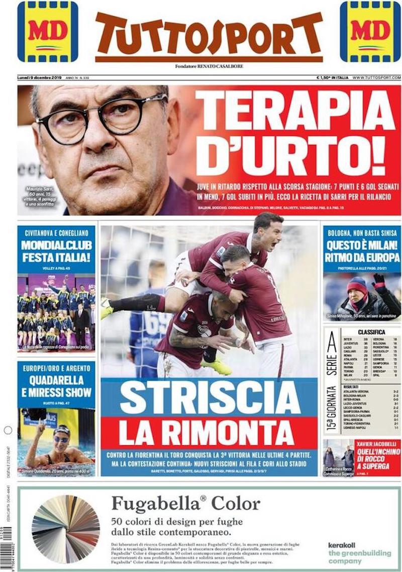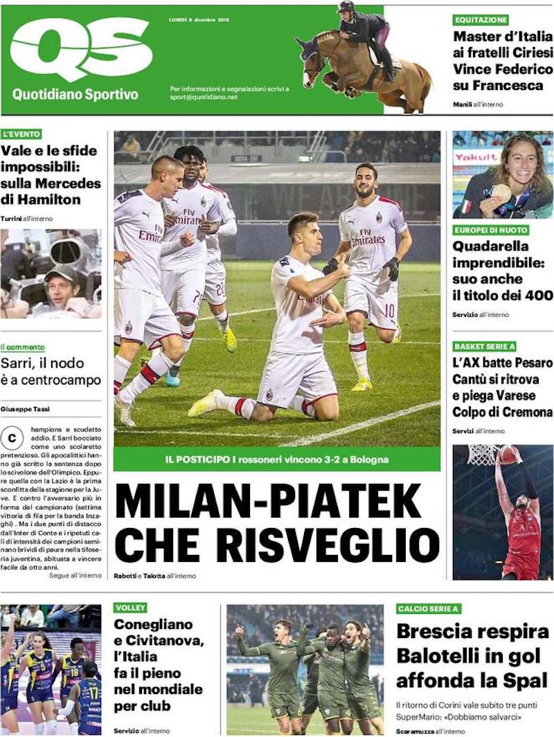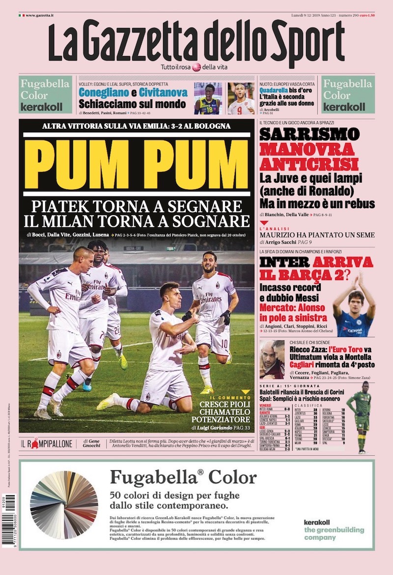 I principali giornali sportivi italiani di oggi, lunedì 9 dicembre, scrivono del campionato di Serie A e dei risultati della 15ª giornata. Nel posticipo di domenica sera il Milan in trasferta ha battuto per 3-2 il Bologna, portandosi in nona posizione in classifica. Condivide il nono posto con il Torino, che sempre ieri ha battuto 2-1 la Fiorentina, mentre il Cagliari ha pareggiato 2-2 in trasferta contro il Sassuolo.