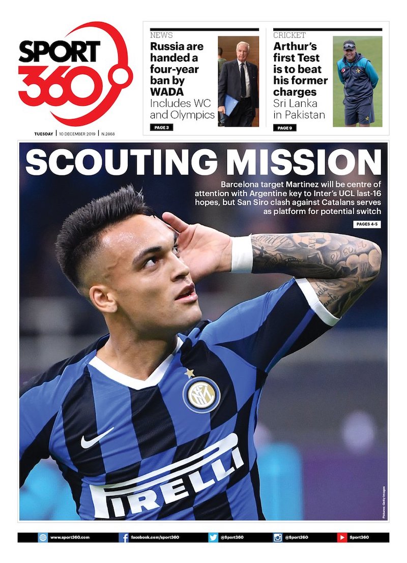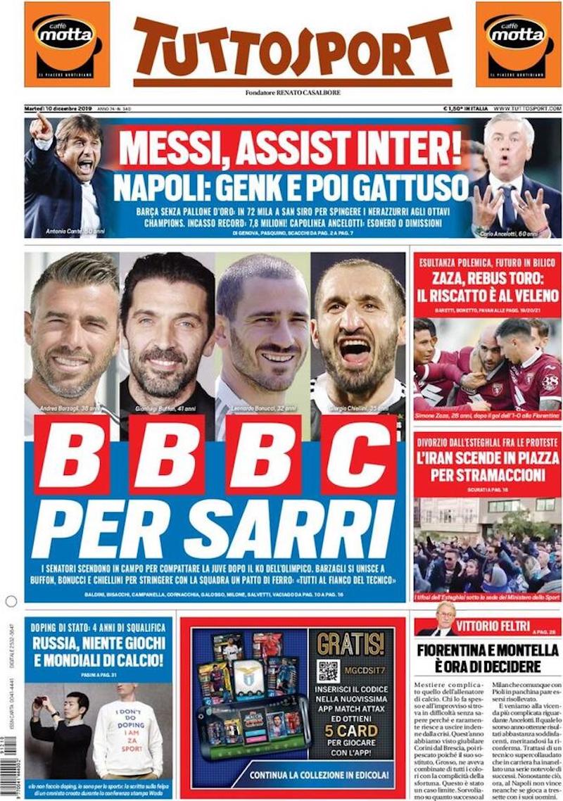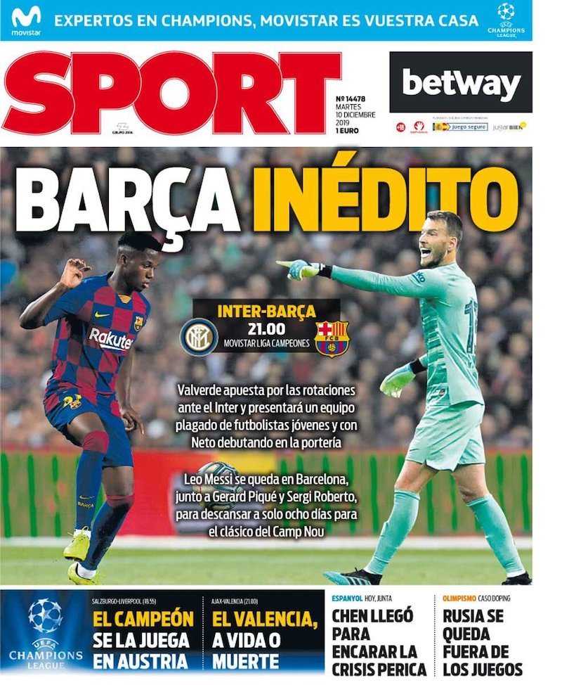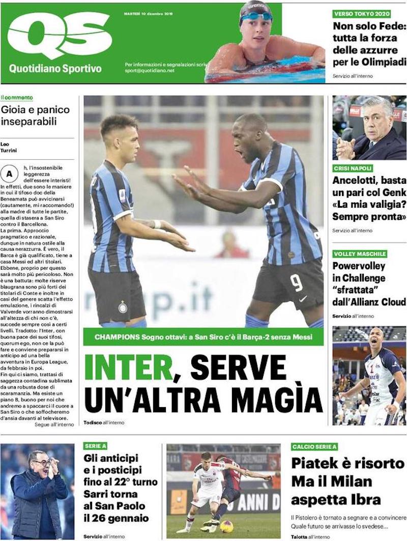 I principali quotidiani sportivi nazionali di oggi, martedì 10 dicembre, aprono con le ultime sulla partita di Champions League di stasera in programma tra Inter e Barcellona. L’Inter ha bisogno di una vittoria per la qualificazione certa agli ottavi. Il Barcellona è già primo nel gruppo e giocherà con molte riserve.