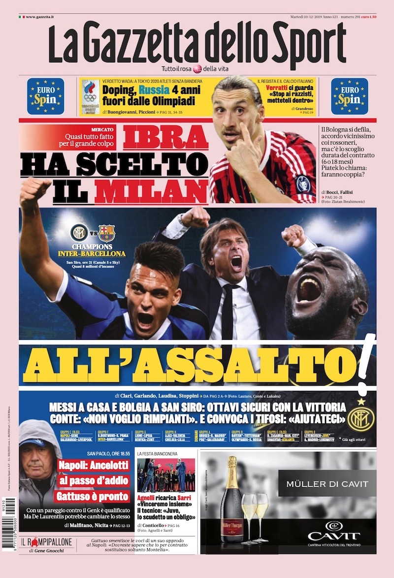 Al Napoli basterà un pareggio in casa contro il Genk per ottenere la qualificazione. E secondo i giornali potrebbe essere l’ultima partita da allenatore del Napoli per Carlo Ancelotti, a causa delle recenti divergenze con la società. La Gazzetta dello Sport dà inoltre ormai per certo o quasi il passaggio di Zlatan Ibrahimovic al Milan, con un contratto da sei o da diciotto mesi.