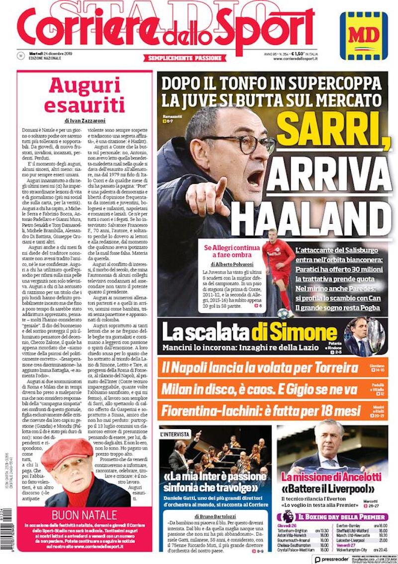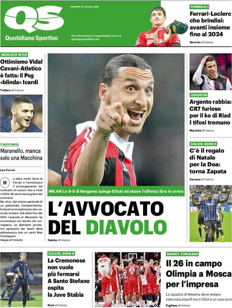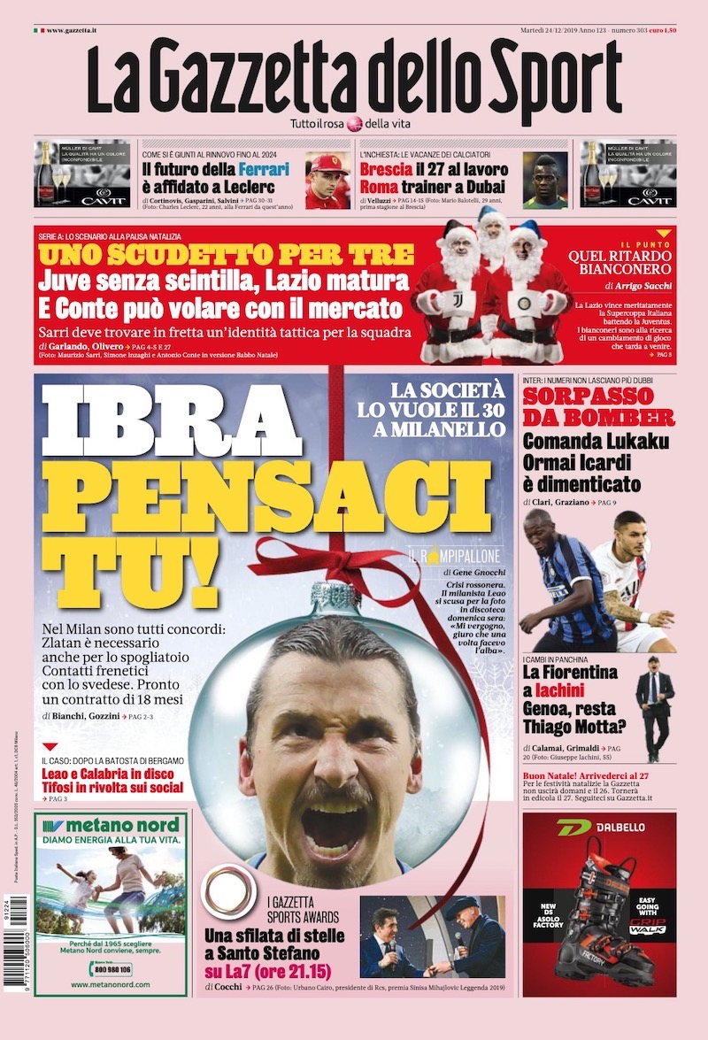 La Gazzetta dello Sport dedica oggi la foto in prima pagina a Zlatan Ibrahimovic, al centro di una presunta complessa trattativa con il Milan. Il trentottenne centravanti svedese lascerà la sua attuale squadra americana, i L.A. Galaxy, alla fine dell’anno. Il Milan, scrivono da tempo i giornali, starebbe facendo di tutto per convincerlo ad accettare di tornare in Italia e firmare un contratto di un anno e mezzo.