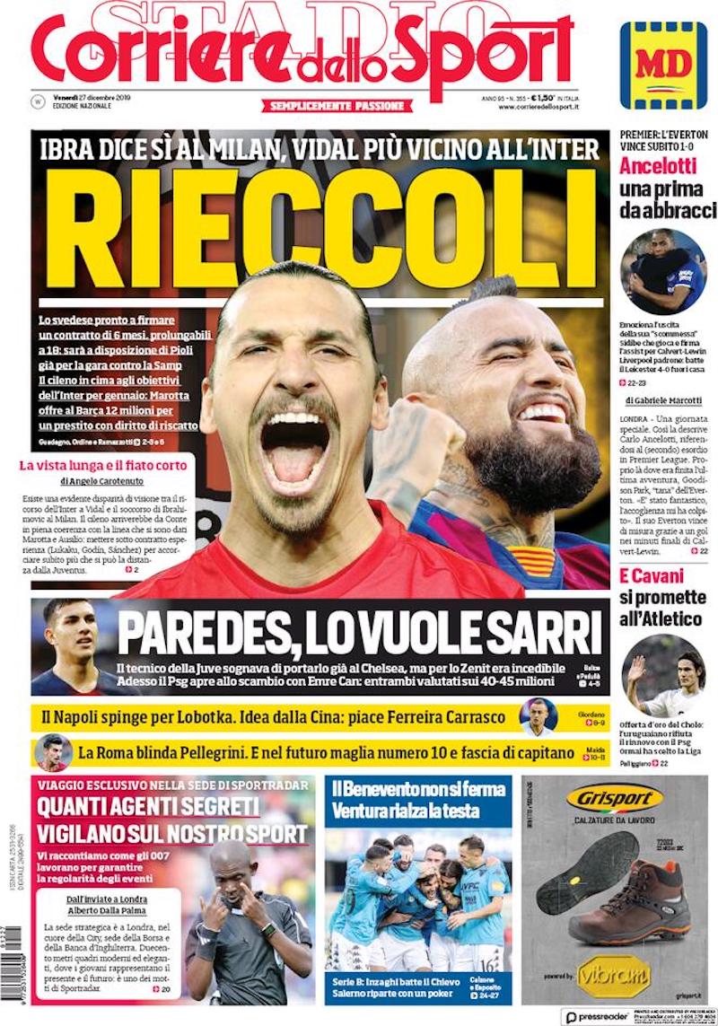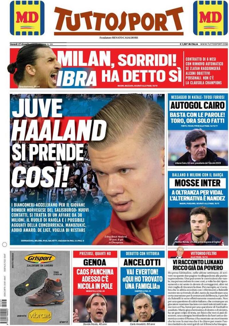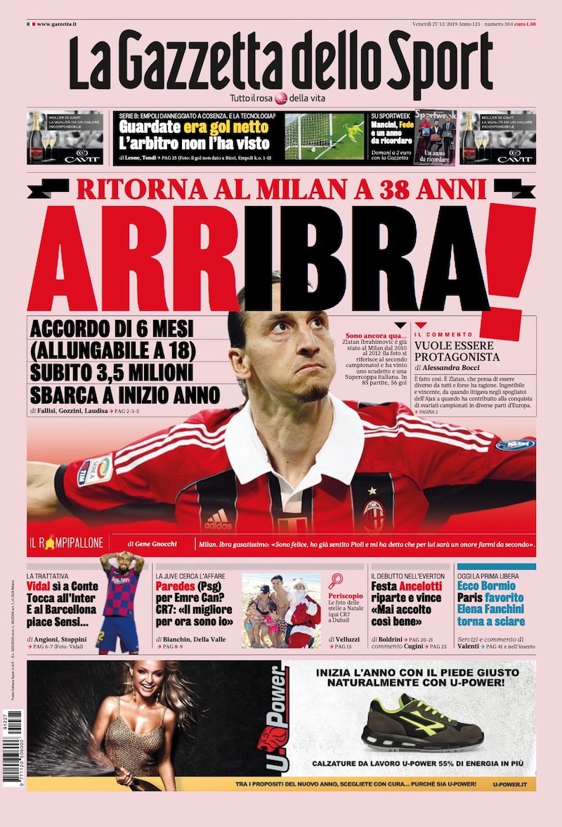 I principali quotidiani sportivi italiani di oggi, venerdì 27 dicembre, aprono tutti con Zlatan Ibrahimovic. Secondo un’anticipazione diffusa ieri dal cronista sportivo Gianluca di Marzio, il trentottenne centravanti svedese avrebbe accettato il trasferimento al Milan fino al termine della stagione. Il suo contratto, rimarcano oggi i giornali, sarebbe estendibile per un altro anno a determinate condizioni non ancora rese note.