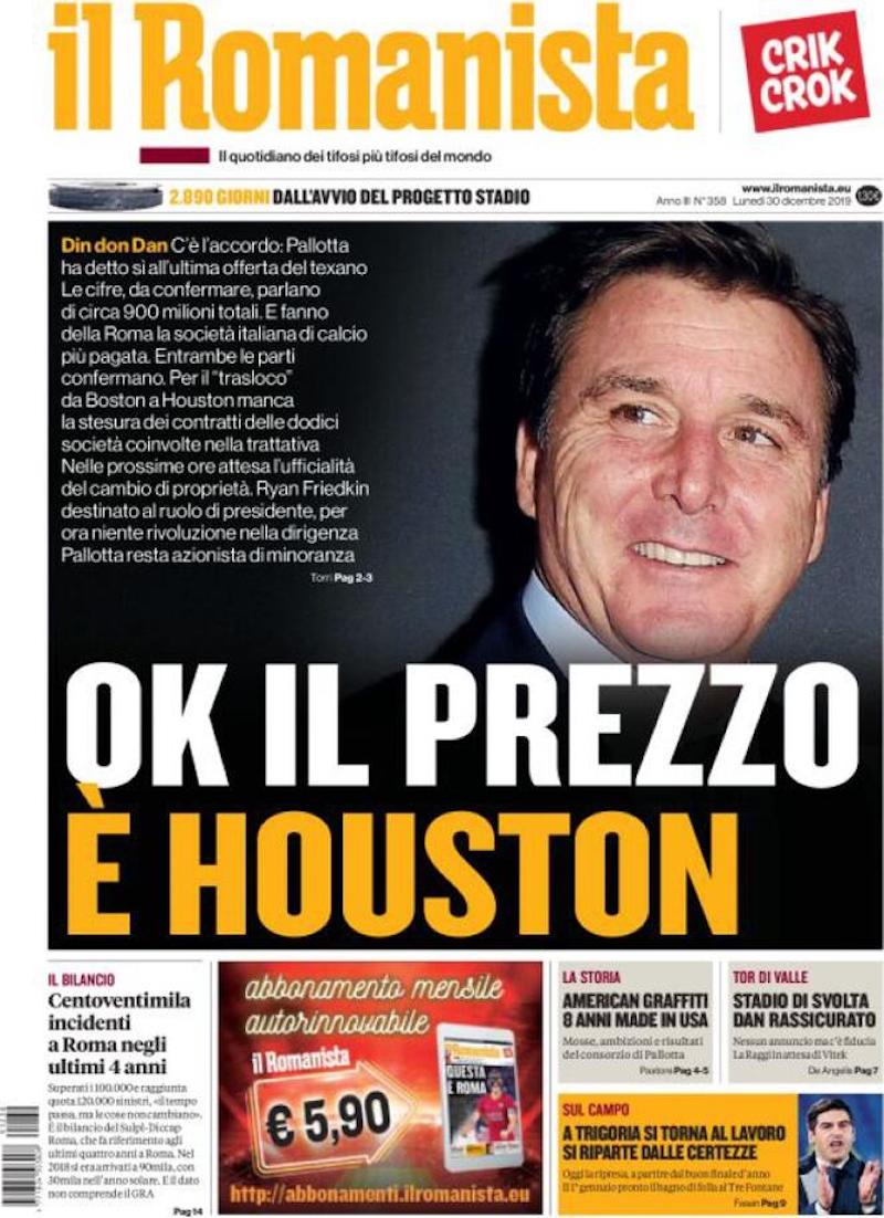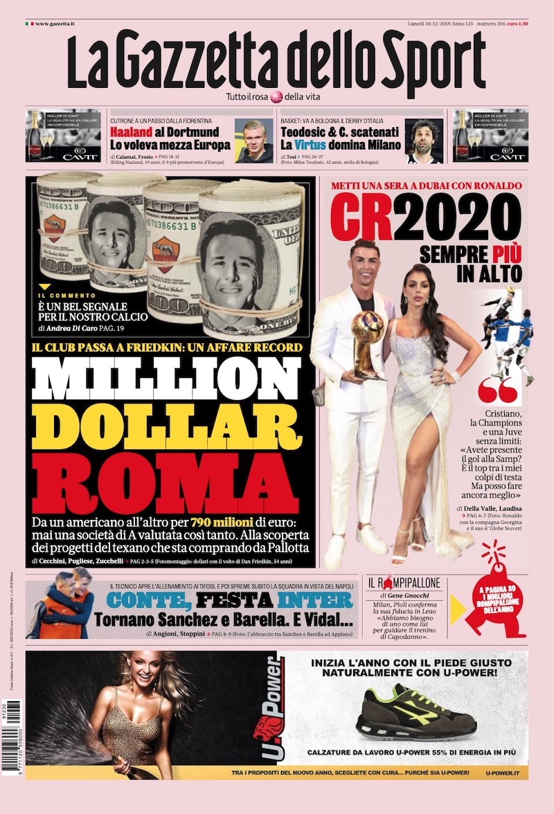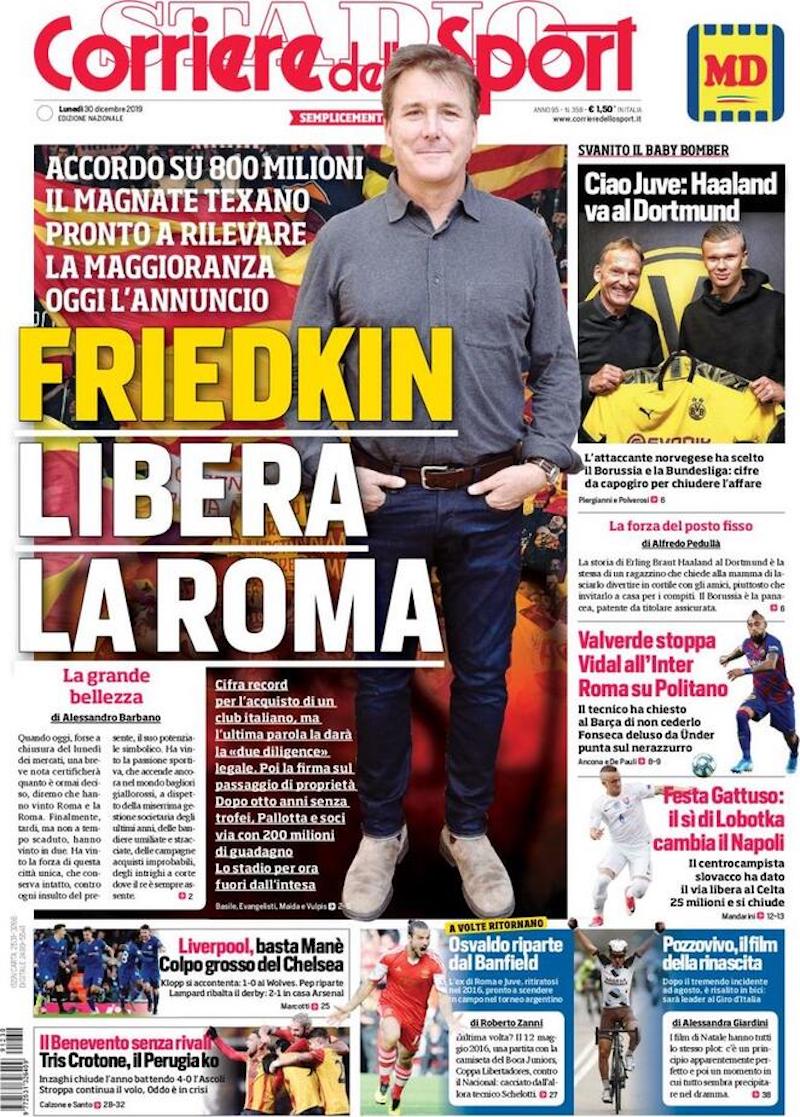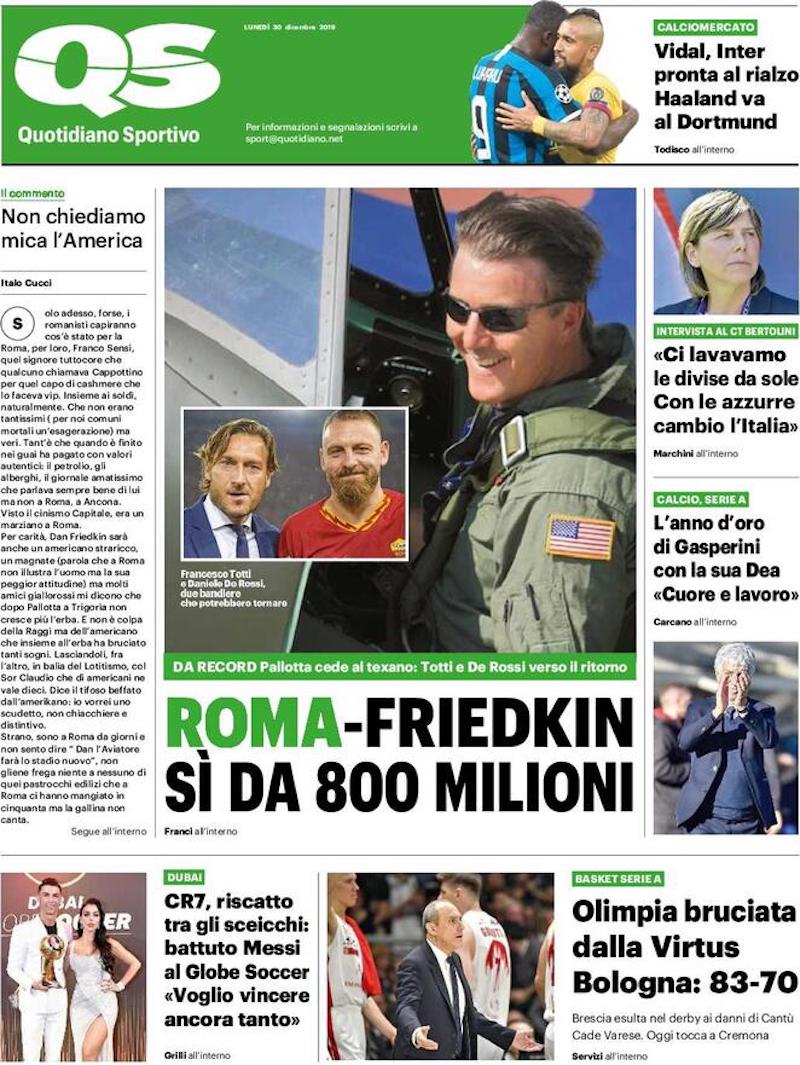 Tutti i principali quotidiani sportivi di oggi, lunedì 30 dicembre, aprono con l’offerta dell’imprenditore statunitense Dan Friedkin per l’acquisto della Roma. Ieri la società ha confermato in un comunicato l’esistenza di una trattativa per il passaggio di proprietà. James Pallotta resterebbe azionista di minoranza, cedendo le quote di maggioranza al gruppo Friedkin.