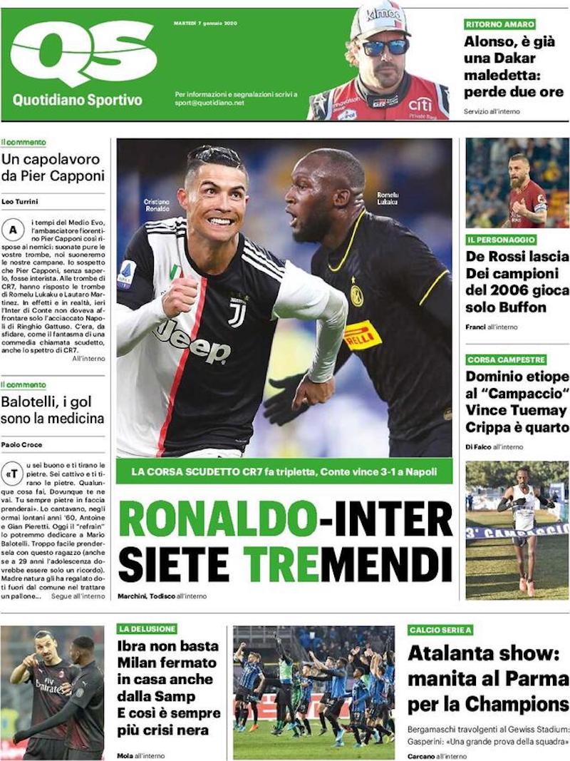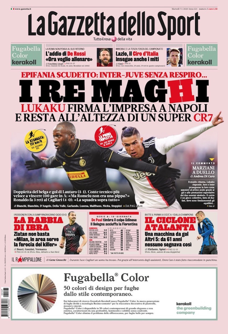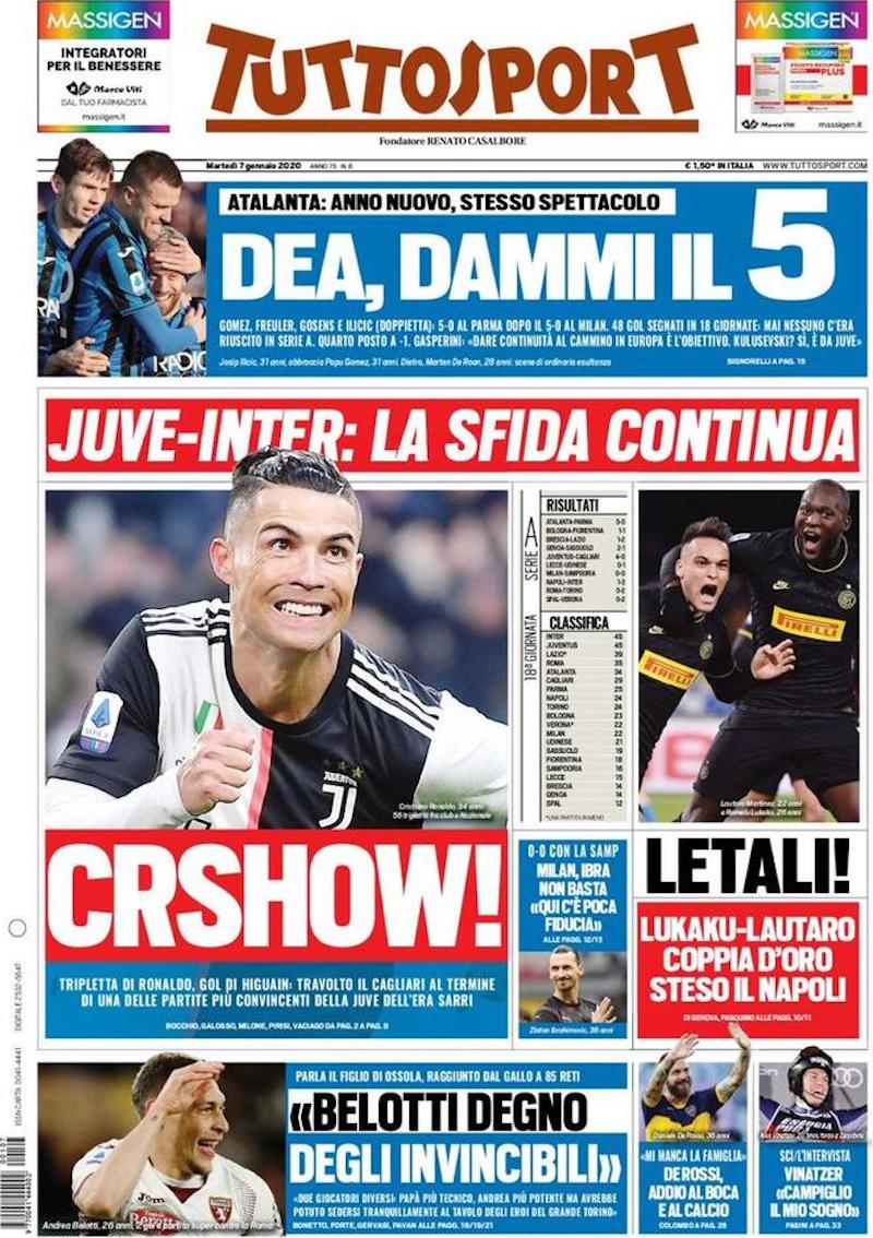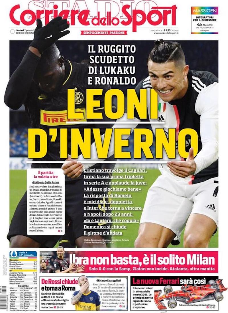 I principali quotidiani sportivi italiani di oggi, martedì 7 gennaio, si occupano prevalentemente dei risultati della diciottesima giornata di Serie A. “I Re Maghi” è il titolo usato dalla Gazzetta dello Sport per definire Cristiano Ronalo e Romelu Lukaku. La Juventus ha battuto il Cagliari per 4-0, con tre gol di Ronaldo, dopo un primo tempo relativamente equilibrato.