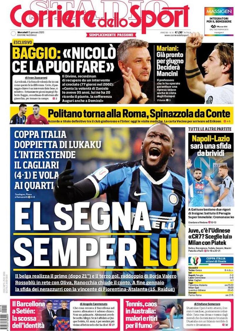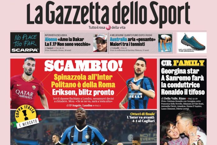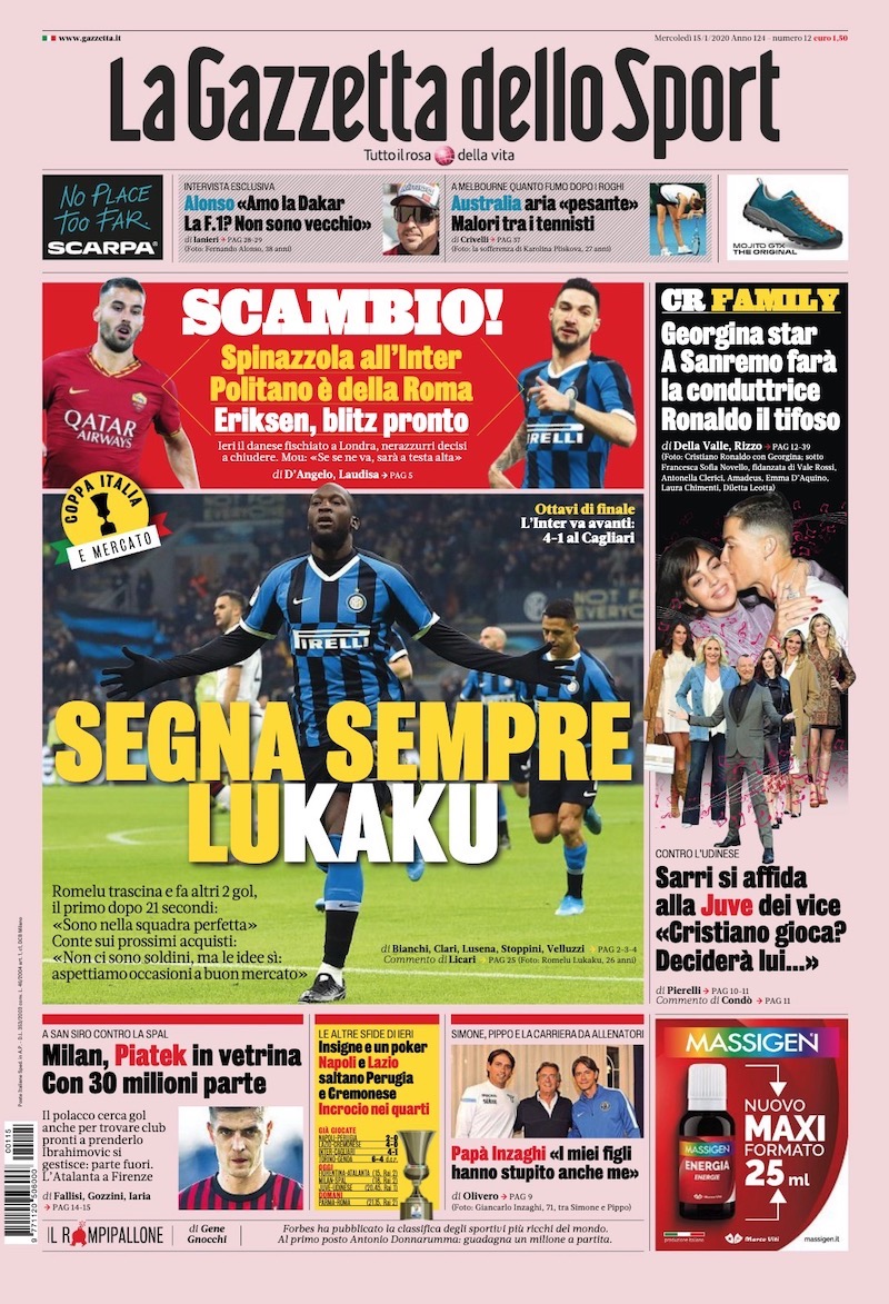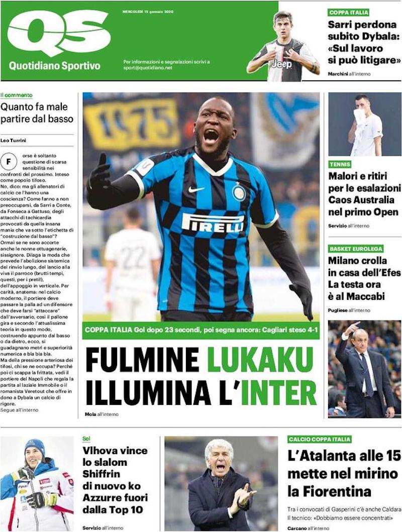 I quotidiani sportivi di oggi riportano i risultati delle prime partite degli ottavi di Coppa Italia, e con pari evidenza le ultime sul calciomercato. L’Inter ha battuto 4-1 il Cagliari a San Siro, con due gol di Romelu Lukaku. Nelle due partite precedenti la Lazio ha battuto 4-0 la Cremonese e il Napoli 2-0 il Perugia.