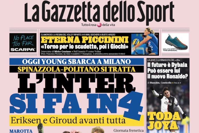 Gran parte delle prime pagine dei principali quotidiani sportivi italiani di oggi è dedicata alle trattative di calciomercato dell’Inter. Dopo il rallentamento relativo allo scambio Politano-Spinazzola, la società sembra infine aver trovato un accordo con la Roma.