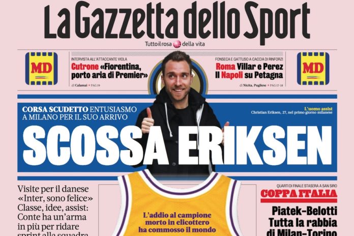 I quotidiani sportivi di oggi, martedì 28 gennaio 2020, dedicano ancora molto spazio in prima pagina a Kobe Bryant. All’interno proseguono le celebrazioni, i ricordi e le interviste agli ex colleghi del campione statunitense di basket, tragicamente morto domenica scorsa in un incidente in elicottero vicino Los Angeles.