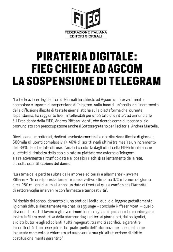 “La diffusione illecita di testate giornalistiche su Telegram ha raggiunto durante la pandemia livelli intollerabili per uno Stato di diritto”, ha concluso Andrea Rifesser Monti, presidente della FIEG.