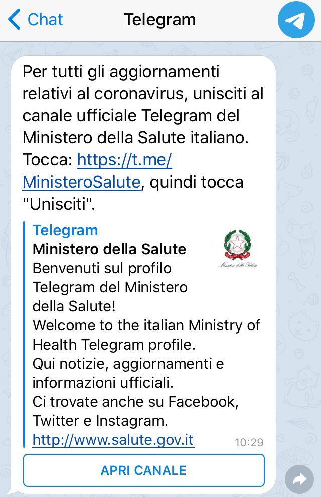 Nelle ultime settimane molti canali Telegram istituzionali in tutto il mondo sono stati aperti per diffondere informazioni sul coronavirus. Tramite una notifica, Telegram ha anche segnalato la disponibilità di questi canali ai suoi utenti. Il canale ufficiale del Ministero della Salute italiano conta al momento oltre 425 mila utenti iscritti.