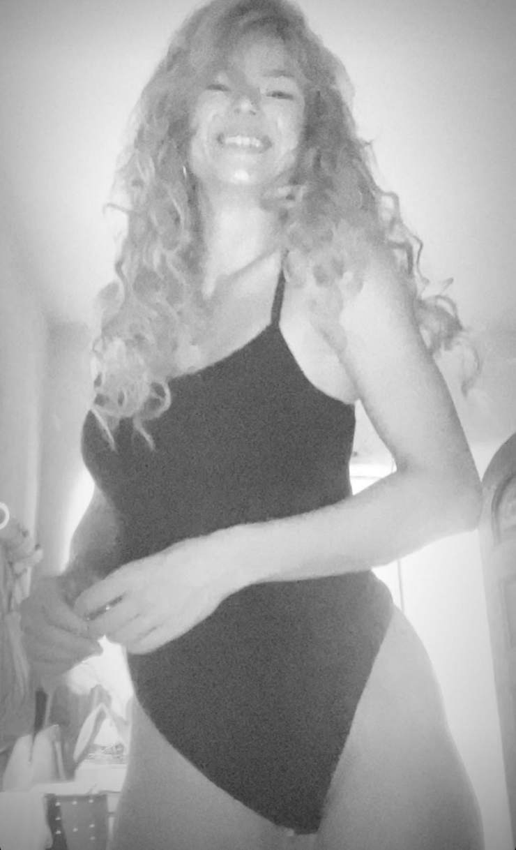 Semplice: con indosso questo body nero, in perfetto stile Flashdance, è veramente deliziosa. Non solo per l’ampia scollatura del capo di intimo che ha scelto di mostrare ai suoi follower, e neanche per le splendide gambe in primo piano, evidenziate dal taglio sgambato del body stesso.