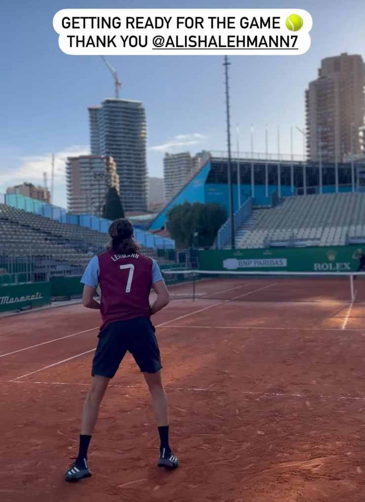 Stavolta è stata Alisha a fare un regalo a Tsitsipas, tant’è che nel filmato lo si vede allenarsi su un campo in terra rossa con indosso la maglia ufficiale della bella Lehmann.