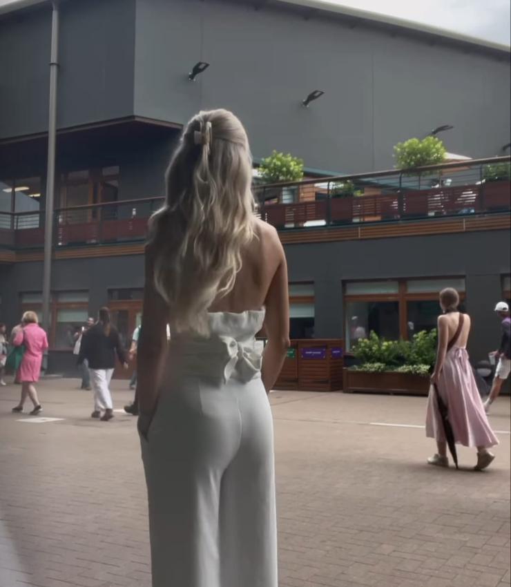 Wimbledon, si sa, fa rima con bianco, ragion per cui ogni suo outfit strizza l’occhio al rigido dress code da sempre in vigore all’All England Club. Nel fine settimana, tanto per fare un esempio, ha sfoggiato un graziosissimo completo total white, composto da pantaloni palazzo e gilet con scollatura vertiginosa. Nel video la si vede di spalle ed è evidente che la luce del giorno le abbia giocato un brutto “scherzo”.