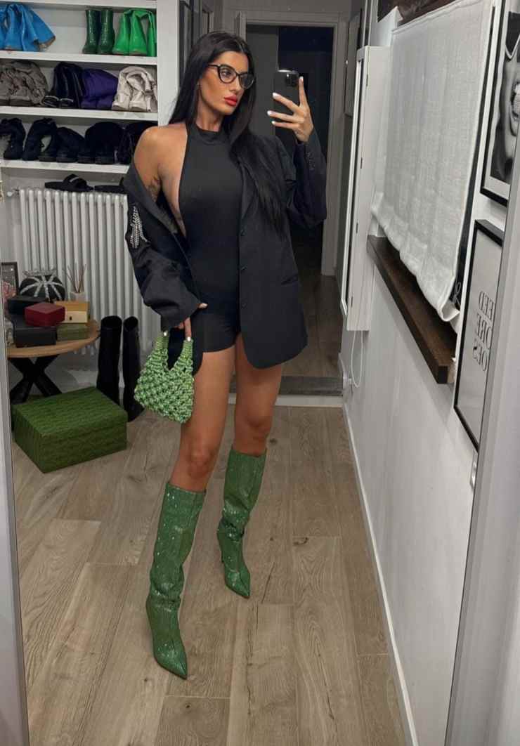 Completano il suo look mozzafiato degli stivali di colore verde, che slanciano ancor di più la sua perfetta silhouette, e degli occhiali che le danno un’aria molto sofisticata. E, probabilmente, ancor più sensuale del solito. Un outfit perfetto in tutto e per tutto, dunque, ma illegale. Illegale come le sue curve.