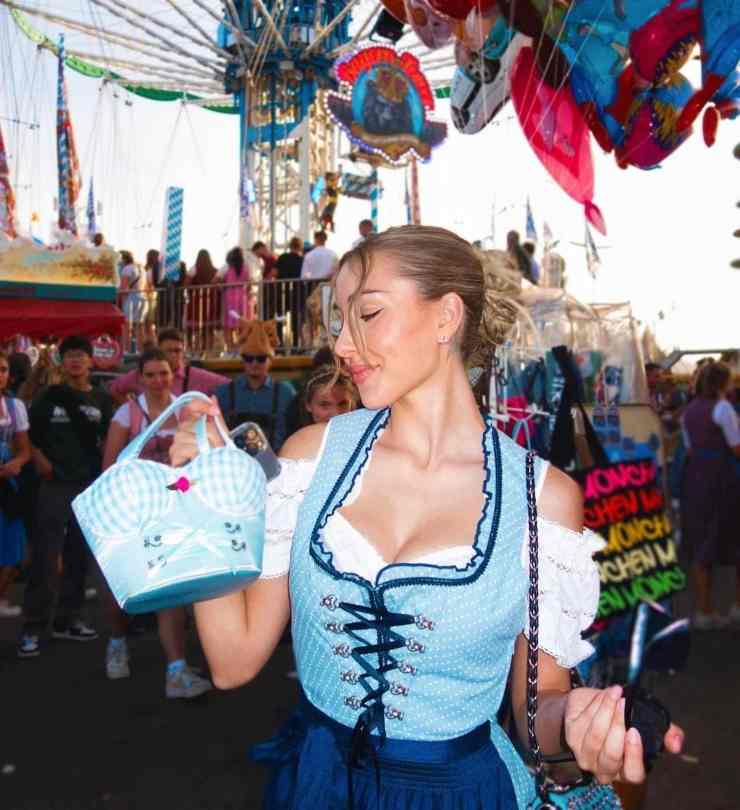 Indossa un abito tipico bavarese, dalla scollatura molto accentuata, che focalizza l’attenzione sul suo maestoso décolleté. Sorride, se la spassa e brinda con un boccale di birra bionda. E speriamo che almeno un Prosit lo abbia dedicato al suo fidanzato, nuovo numero 4 del mondo.