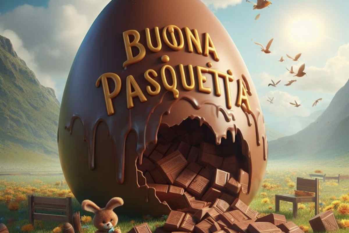 Se c’è una cosa di cui siamo certi è che tutti, nessuno escluso, siamo in questo momenti sommersi di cioccolato da smaltire. Per questo motivo ci è parso adatto alle circostanze chiedere all’intelligenza artificiale di creare per noi un’immagine che avesse come punto focale un gigantesco uovo di cioccolata personalizzato. Un’idea che riteniamo originale e perfetta per gli auguri su WhatsApp.