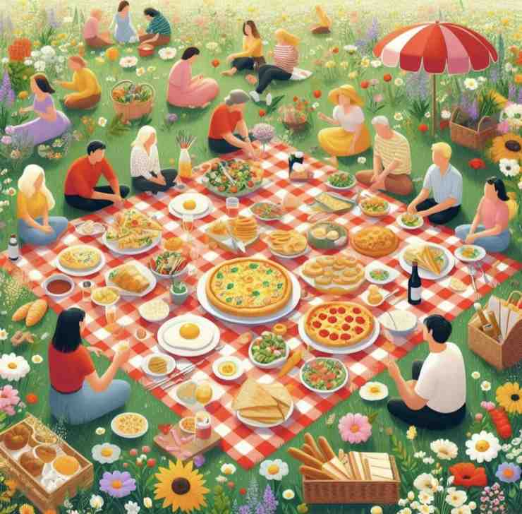 Sono in tanti, all’indomani delle celebrazioni per la Santa Pasqua, a concedersi una gita fuori porta in compagnia di amici e parenti. Ed è usanza portare con sé tutto l’occorrente per allestire un maxi picnic, proprio come quello mostrato in questa immagine creata con l’aiuto dell’intelligenza artificiale. Che ne dici, allora, di organizzare un picnic virtuale anche su WhatsApp?