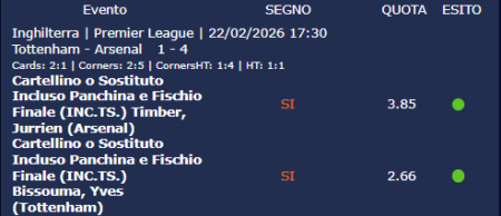 ISCRIVITI al canale TELEGRAM per ricevere GRATIS le notifiche con altri pronostici last minute esclusivi anche su MARCATORI, TIRI E AMMONITI: CLICCA QUI