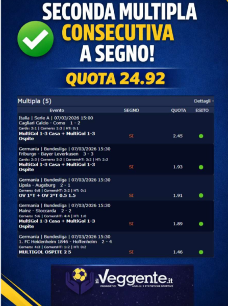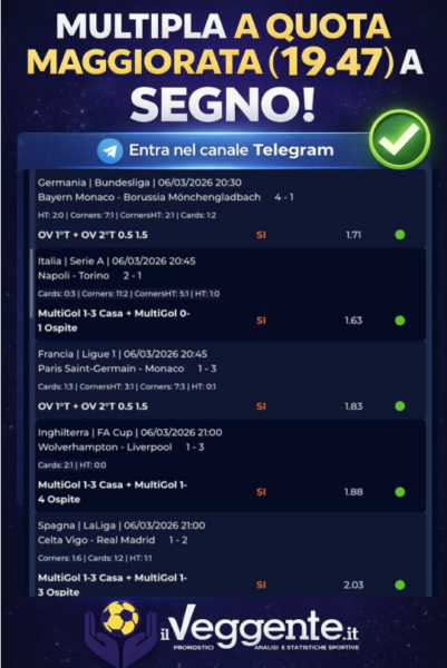 ISCRIVITI al canale TELEGRAM per ricevere GRATIS le notifiche con altri pronostici esclusivi a quota maggiorate come questi vincenti del weekend e anche i pronostici su MARCATORI, TIRI E AMMONITI: CLICCA QUI