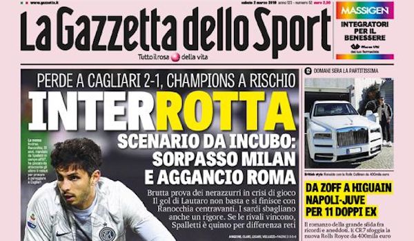 La sconfitta dell'Inter a Cagliari per 2-1 e le ultime sul derby Lazio-Roma di stasera, sulle prime pagine dei quotidiani sportivi di oggi.