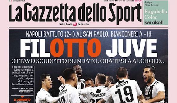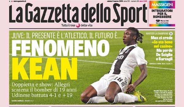 La vittoria della Juventus sull'Udinese, con due gol di Kean, e le altre cose da sapere sulla 27ª giornata di Serie A, sui giornali di oggi.