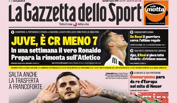 Le ultime su Icardi e l'Inter, l'attesa per le partite delle italiane in Champions e per Real Madrid-Ajax di stasera, sui quotidiani sportivi.