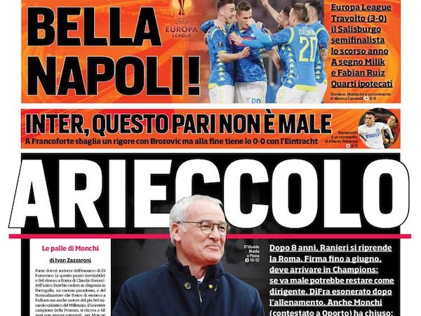 Le ultime su Inter-Eintracht di Europa League e i risultati degli ultimi ottavi di Champions, sulle edizioni odierne dei quotidiani sportivi.