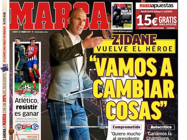 Il ritorno di Zidane al Real Madrid, la prima vittoria della Roma di Ranieri e le ultime su Juventus-Atletico Madrid, sui quotidiani di oggi.